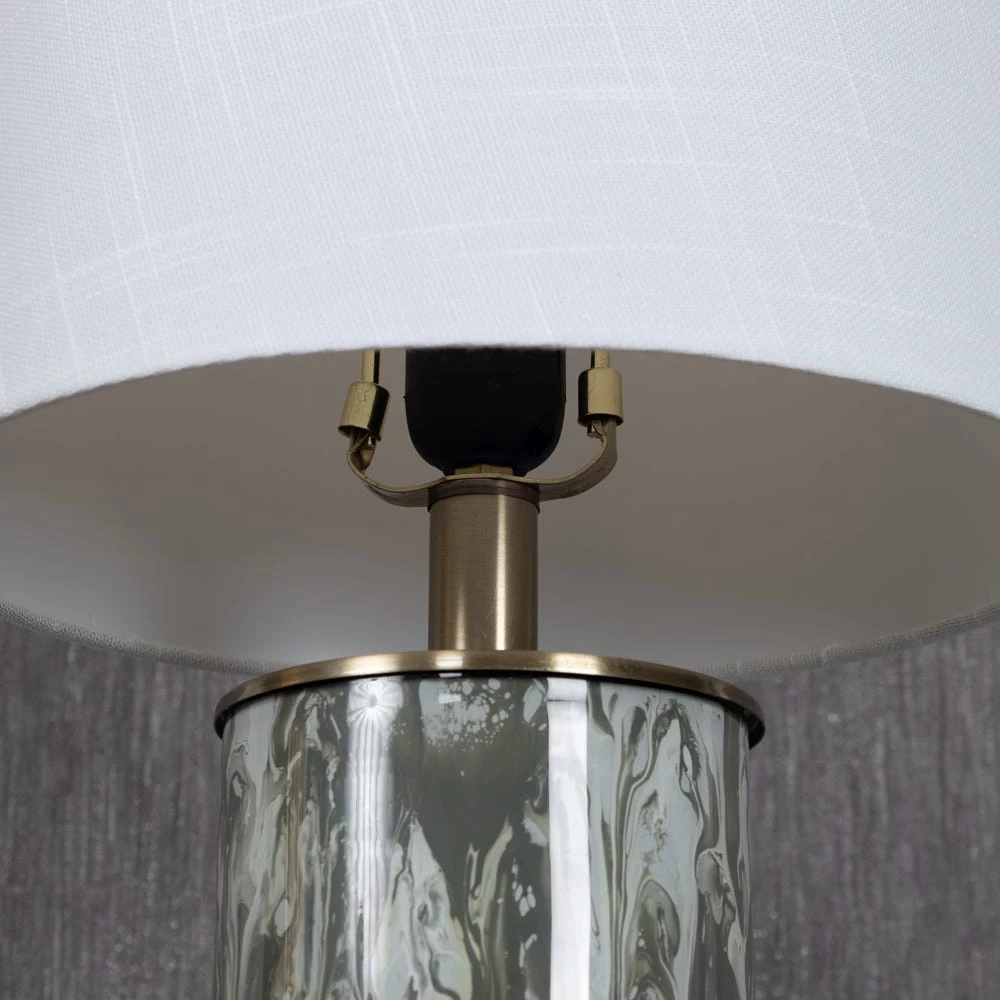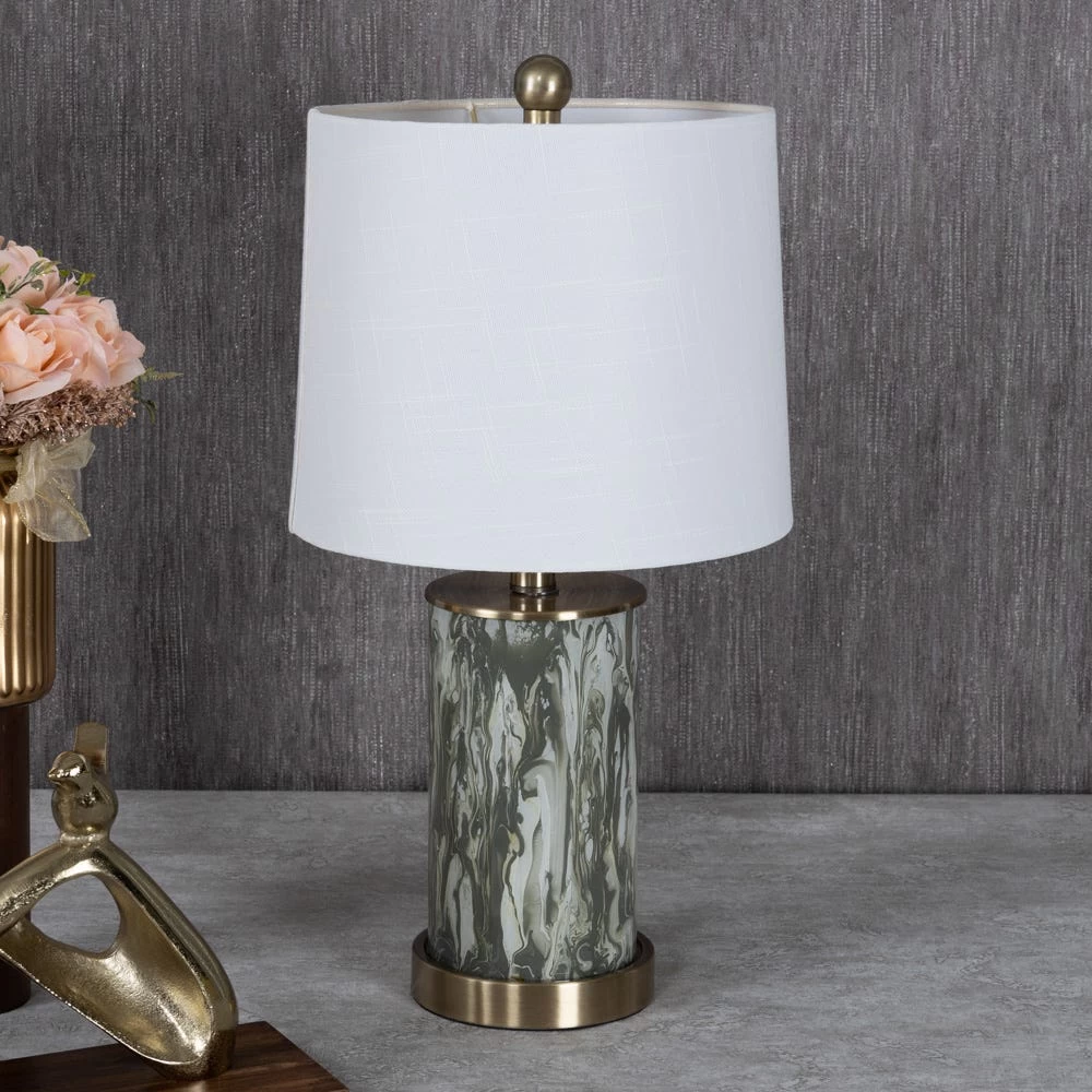 This table lamp elevates the beauty of a room in an instant with its bronze and marble-like accents on its cylindrical base. The white fabric lampshade sets a warm ambient light when provided with an E27 bulb of 60W.