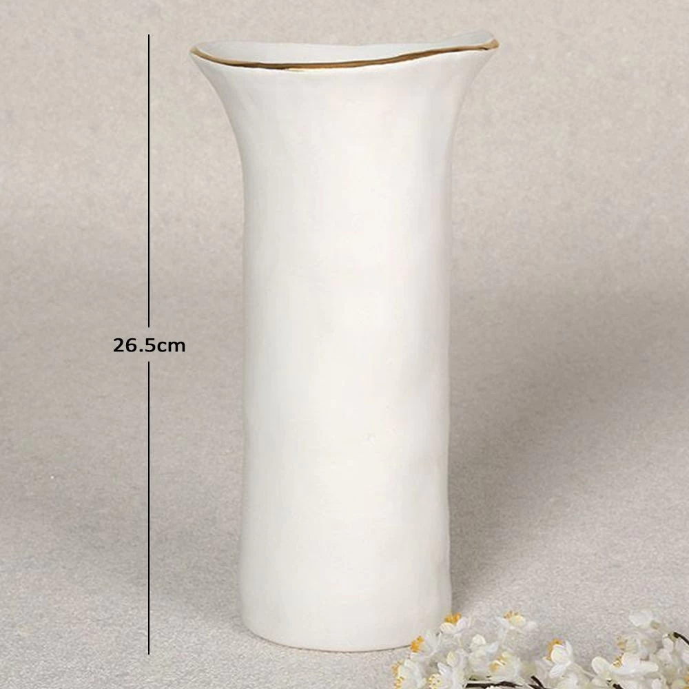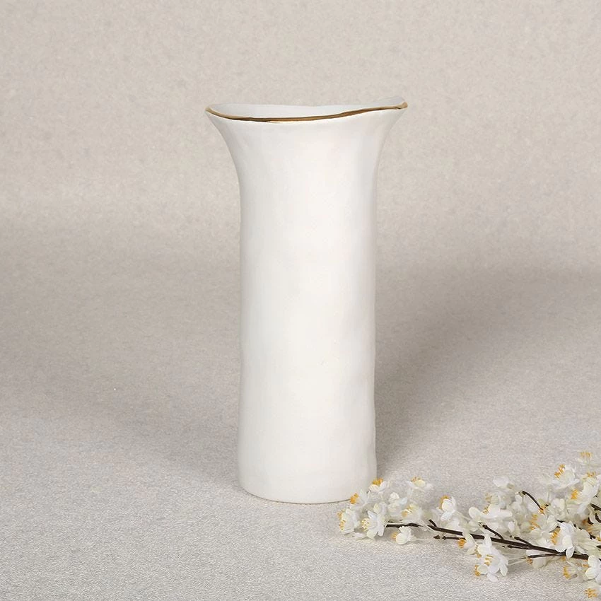 Add a touch of minimalist flair to your living room décor with our Amazonia vase. The soothing white tone with a gold rim and uneven design make it a charming pick for relaxed decor. Highlight your space by adding freshly cut long stem flowers or faux sprays to it.