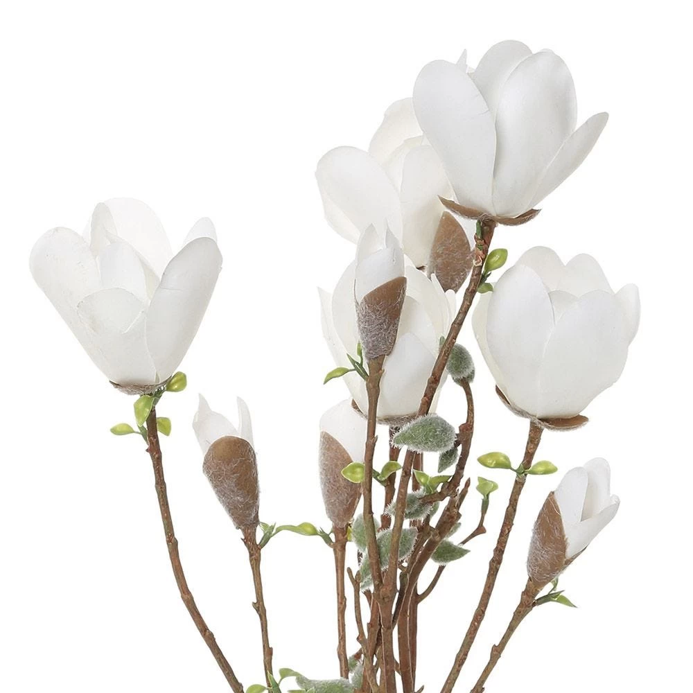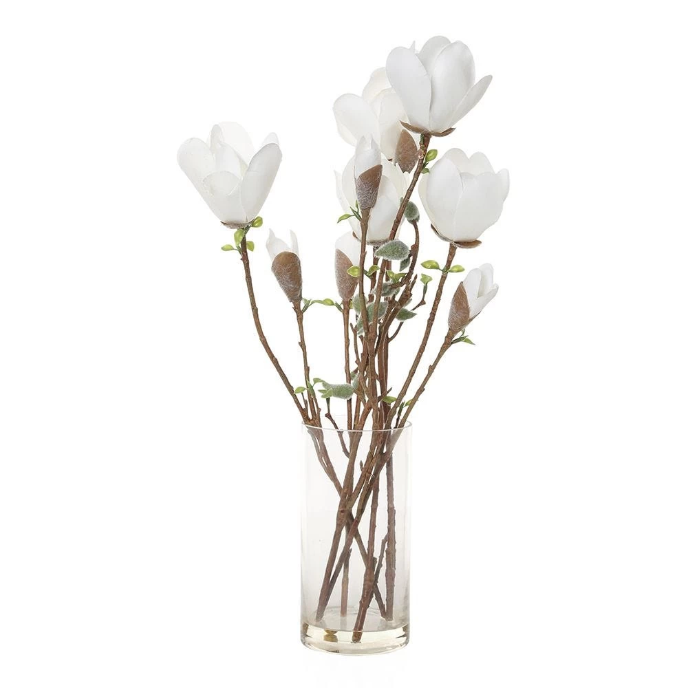 Deck up your home décor with these fresh-looking white blossoms, accented with buds. The elongated brown stems and delicate clear glass vase add to the elegance. Gift it or get one for your home.