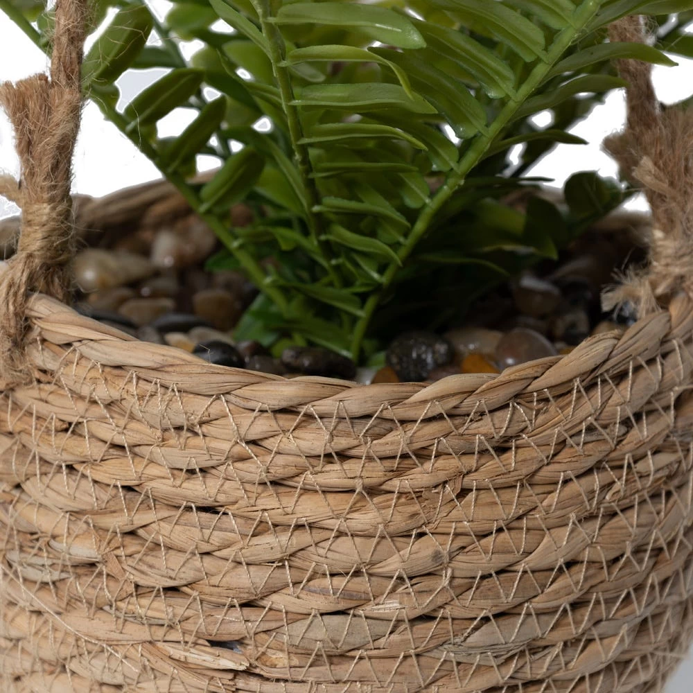 Thanks to the elongated glossy green leaves, the artificial rattan fern will be an attention-grabbing hanging plant that is low-maintenance and will look stunning all year round. Placed on a braided basket with a brown rope hanger, it will round off the cosy ambience in your living space, dining room, bedroom, corridors and entryways.