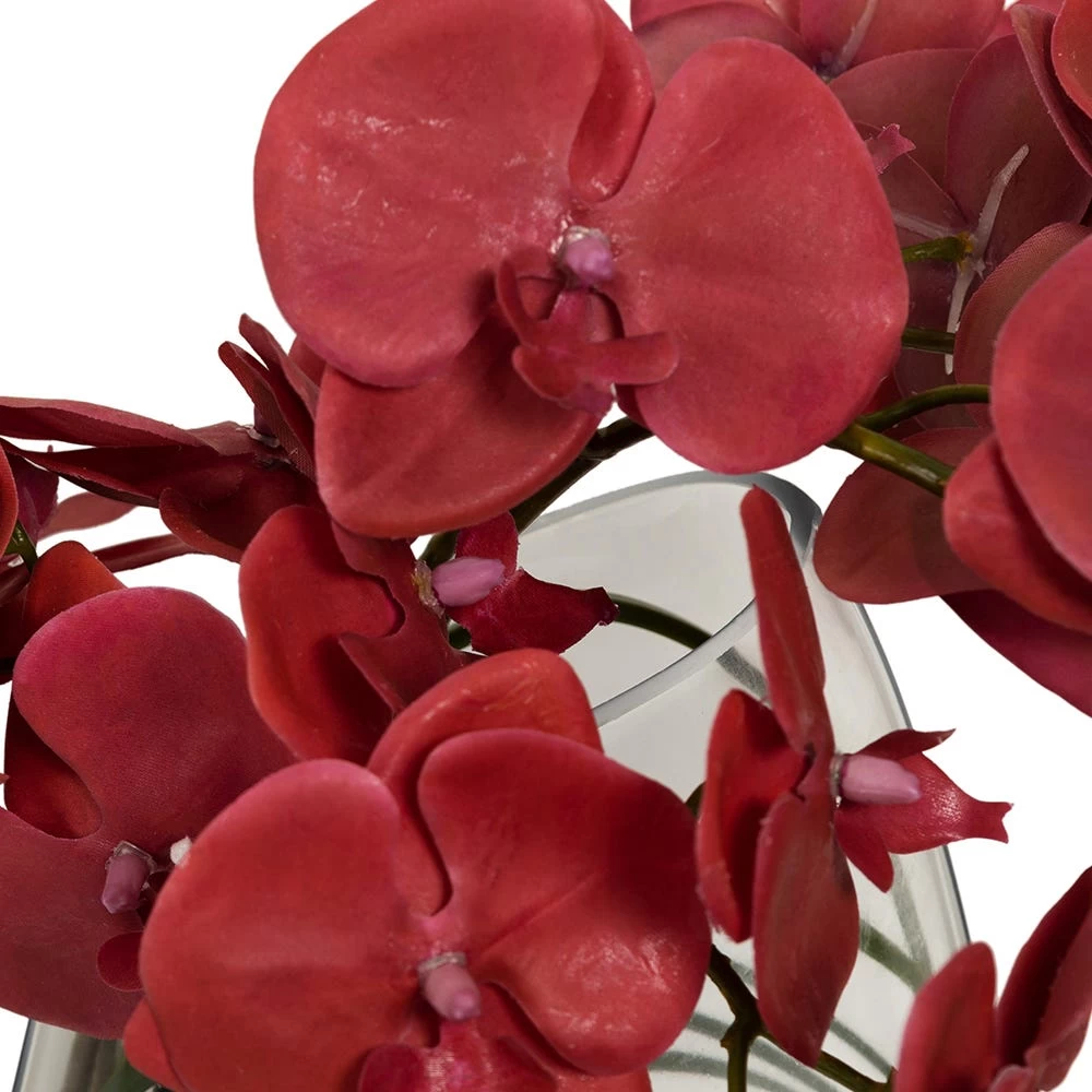 Bring nature indoors by decorating your house interiors with this orchid in a glass vase. Made using fabric plastic, this flower vase set features beautiful artificial orchids in burgundy with a natural look and feel for an elegant appearance, and a clear glass vase for better visibility.