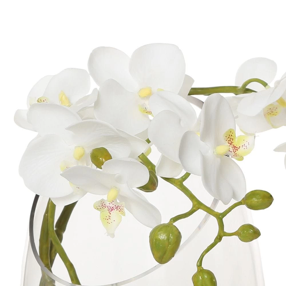 These faux Phalaenopsis blooms, highlighted with yellow accents and buds, come in a glass pot that beautifully highlights their natural charm. Put this on display anywhere in the house and add a charming appeal to your living space.