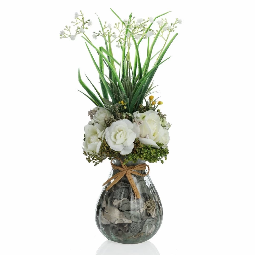 Add this amazing white artificial flower arrangement to brighten up your interior d�cor style. The delicately crafted rose and gypsophila blossoms impart a realistic look to your existing decorations. Made with polyester pongee and ethically sourced materials, these eco-friendly artificial flowers have been handcrafted by experts. Display it as a centrepiece or on the side table for aesthetic appeal.