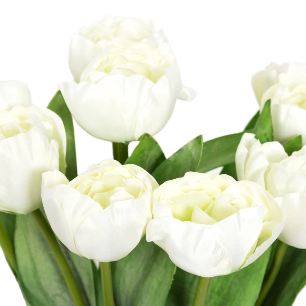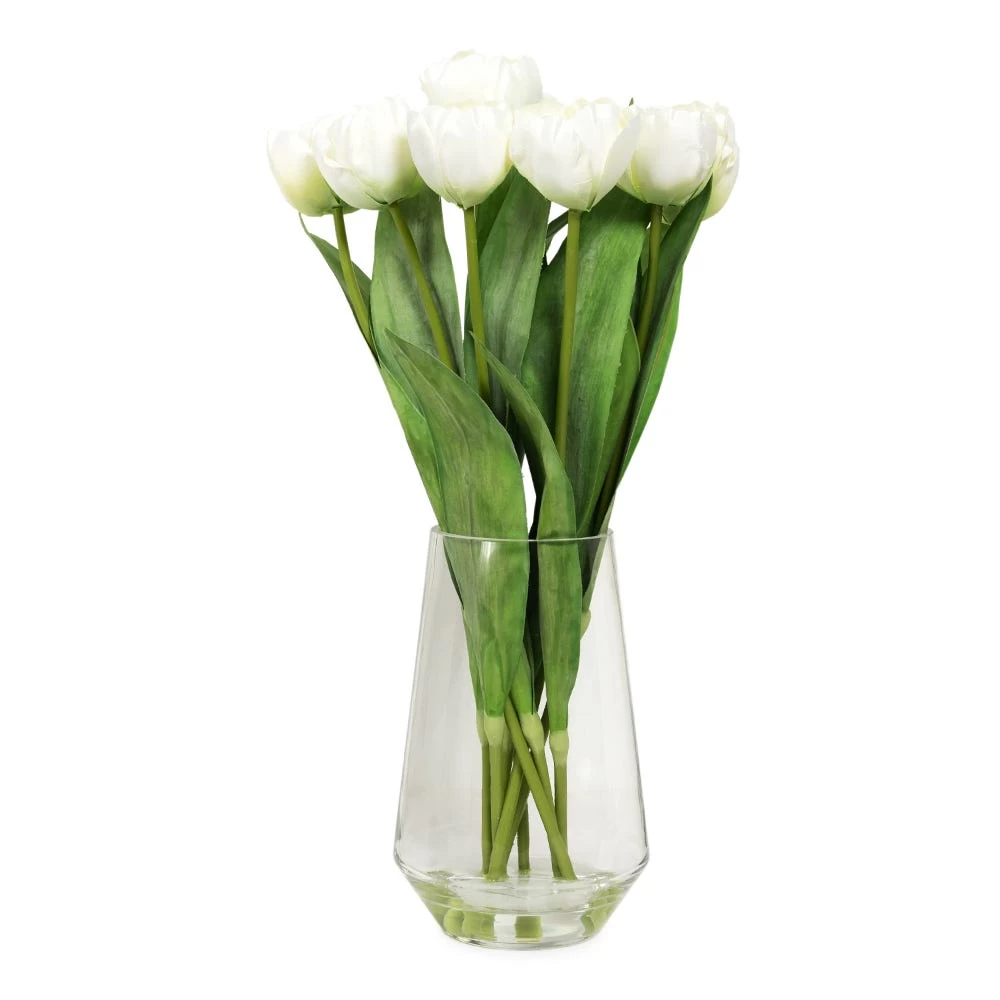 Show off your artistic and creative sense by decorating your living room with this beautiful tulip in a glass vase. This flower vase set is crafted using fabric plastic, and features elegant artificial tulips with a natural look and feel, giving them a graceful and calming appearance. These flowers come in a clear glass vase to fully showcase their beauty.