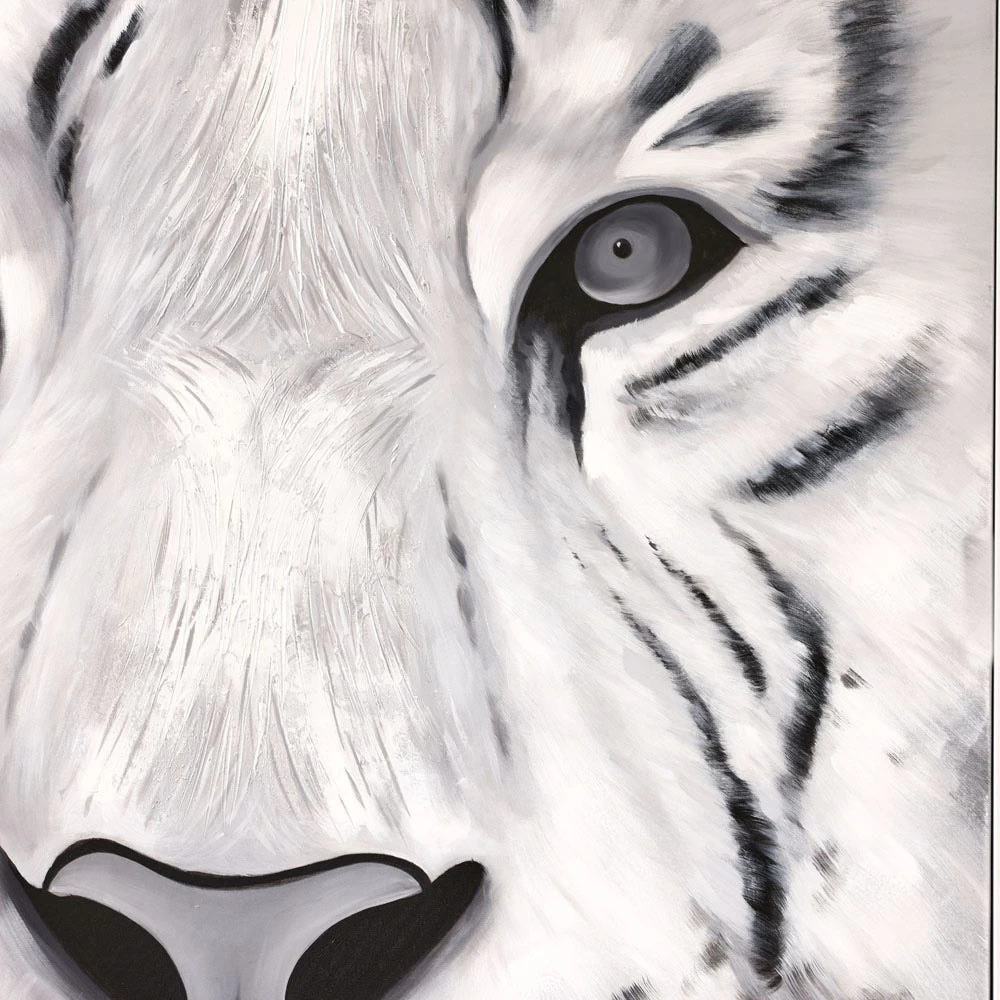 Indulge in the luxurious tones of white, grey, and black as this bold statement piece effortlessly blends to capture the beauty and power of the majestic tiger. It is 100% hand-painted with intricate details, while the white frame and the black, grey, and white hues effortlessly complement any room. Pair it with complementary decor pieces in neutral tones to let the painting be the star of the show.