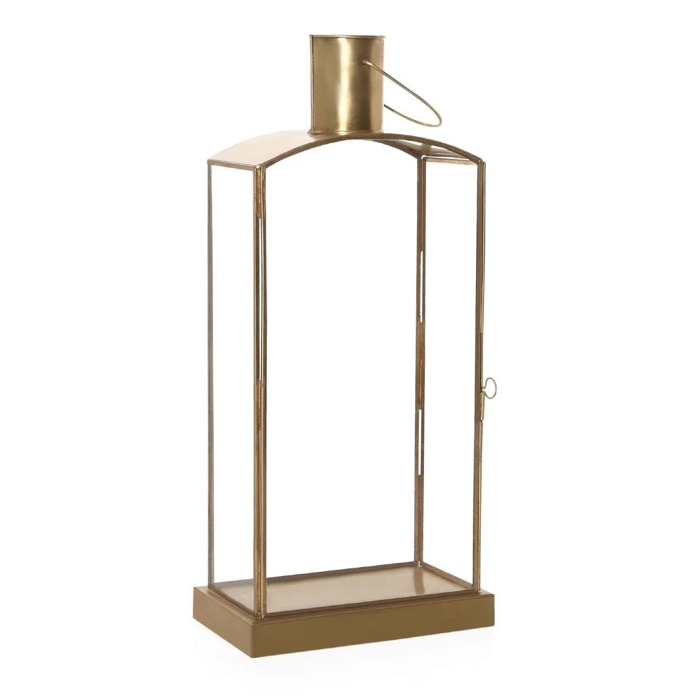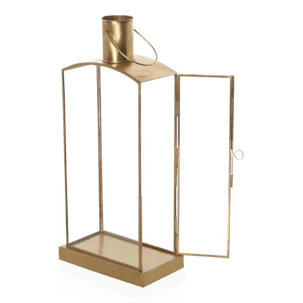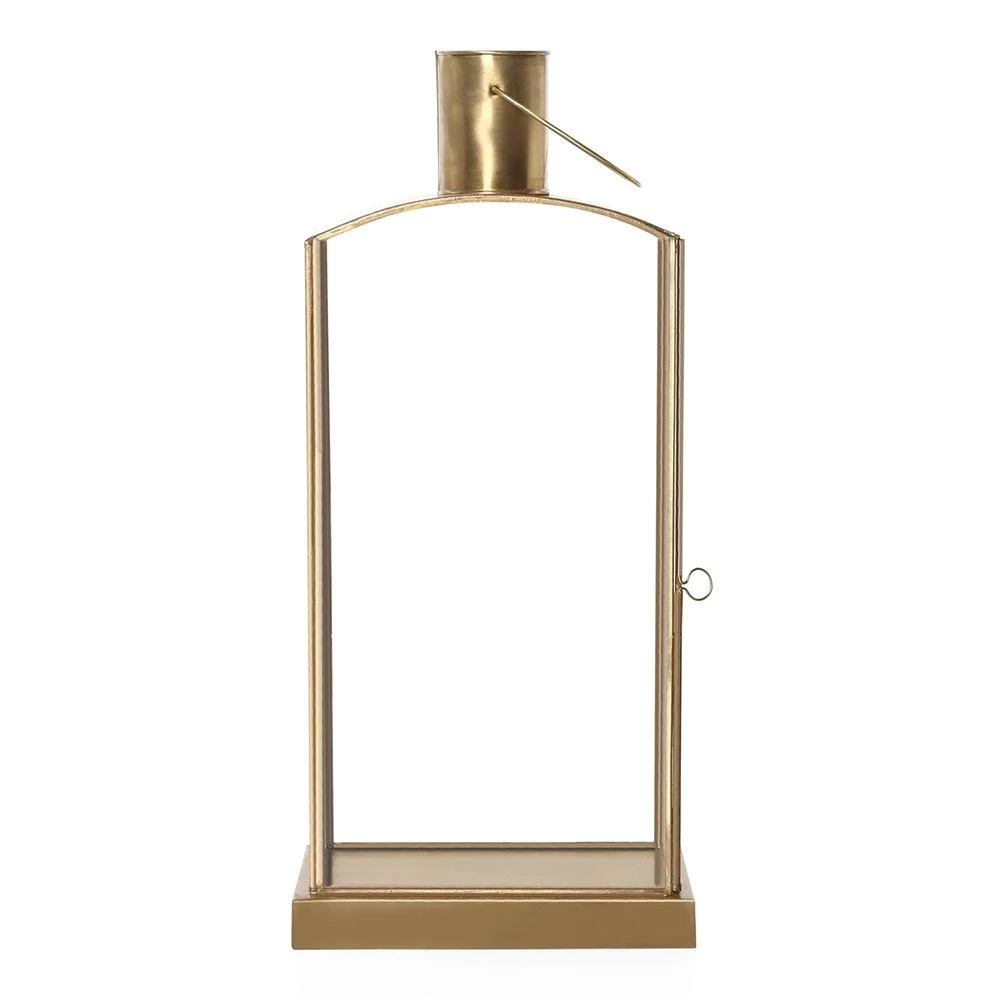 Infuse beauty, charisma, and uniqueness into your living room décor with this beautifully handcrafted candle holder lantern. Featuring the shape of a slim flat bottle, this lantern is crafted with a combination of brass and glass. It has a hanging ring for easy hanging.
