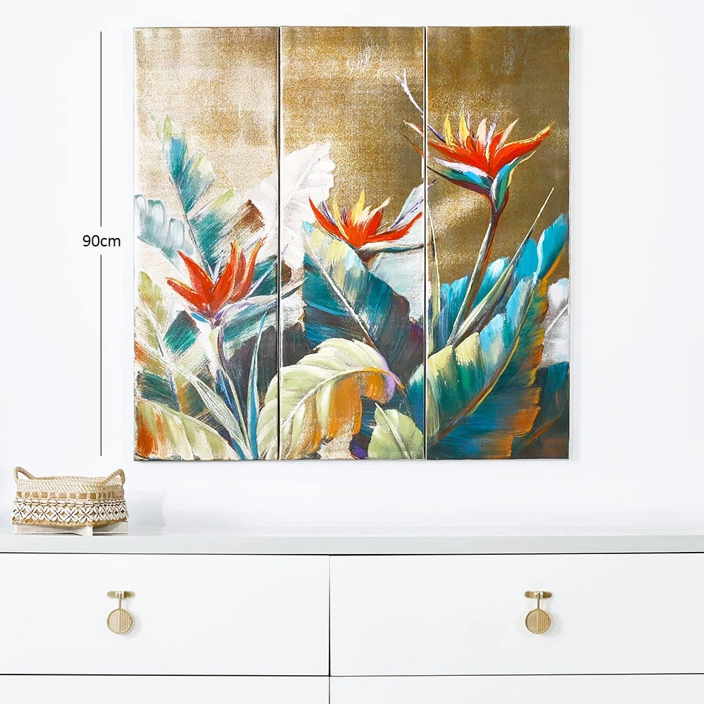 Enhance your living space with this eye-catching canvas frame set. Featuring a sleek design and a handpainted canvas style, these oil painting frames emanate a touch of sophistication to any room. This frame set sports the beauty of a refined floral design that is sure to impress.