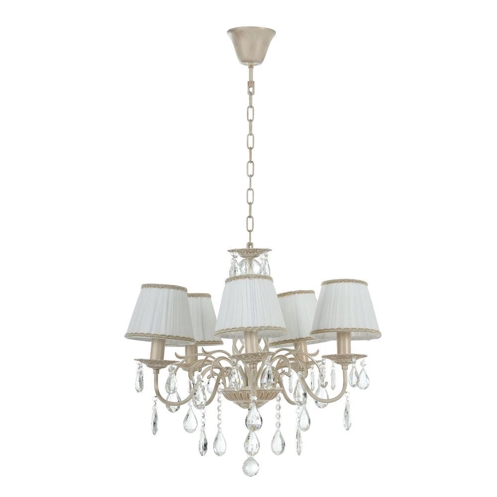 Beautify your living room with this charming Cambridge chandelier. Made from iron, it features five lampshades accentuated with crystal adornments for added visual appeal. The regal design of this chandelier is inspired by a rich Italian heritage. Available in a white-gold hue, it is a choice décor item for your home.