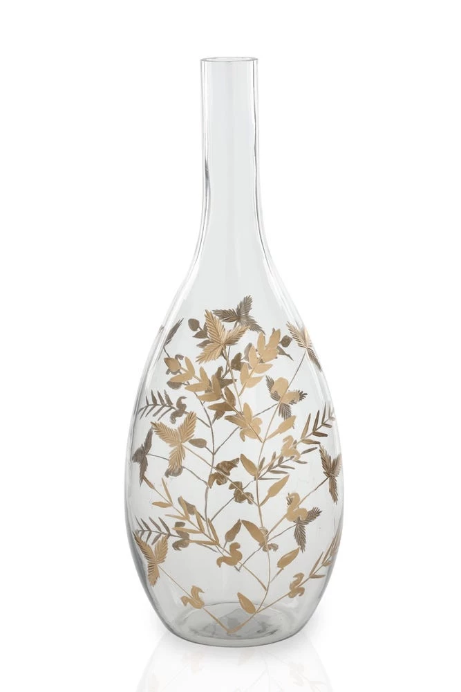 Flaunting a unique etched foliage design, this glass vase has an unconventional appeal inspired by rich Indian heritage. Handmade using mouth-blown glass and painted with gold, it is perfect for displaying dry and fresh flowers. Place this vase atop a shelf in your living room to add a regal vibe.