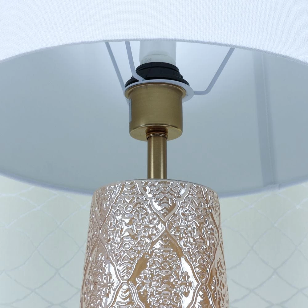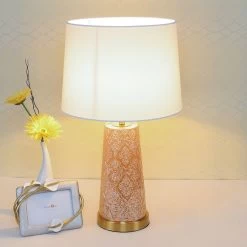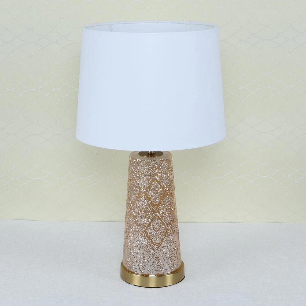 Create an interesting and elegant atmosphere with the addition of this accent table lamp. Showcasing a beautifully sculpted base, this table lamp has a dash of gold for added flair. The white fabric lampshade sets ambient lighting when added with an E27 bulb.