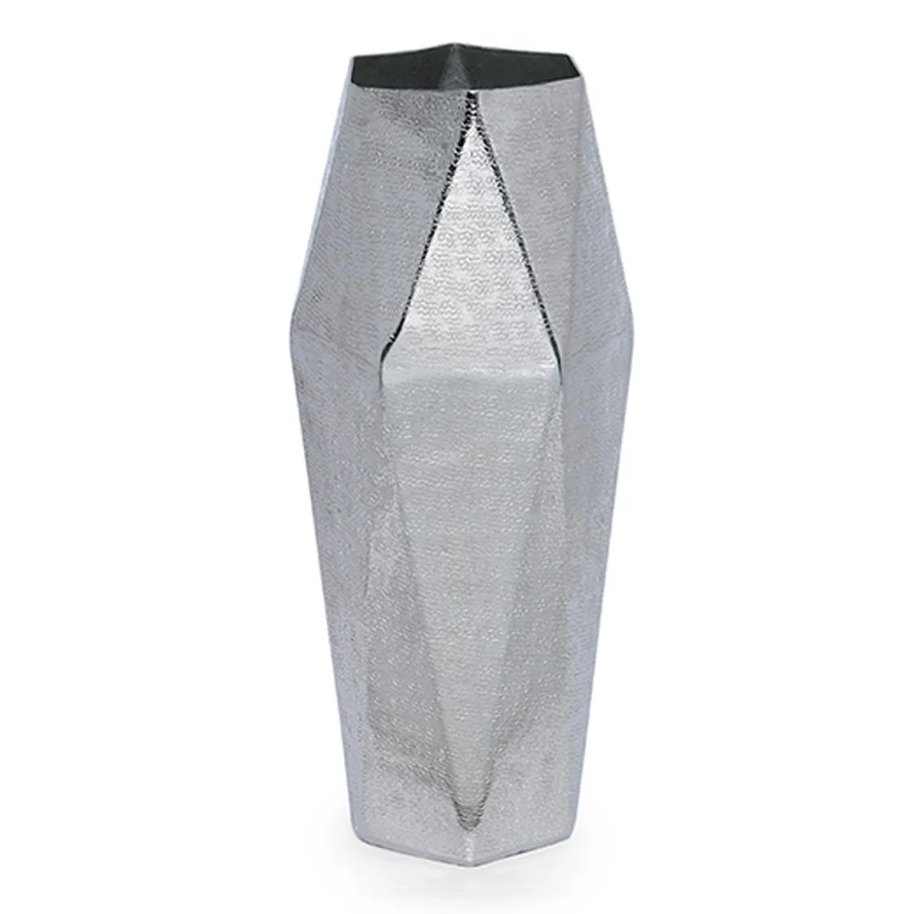 Embrace the sheen of silver and the angular layout of this handmade metallic marvel. Handcrafted by expert Indian artisans, this textured, tapered vase is ideal to display vase fillers, twigs, dried flowers, pampas, and the like.
