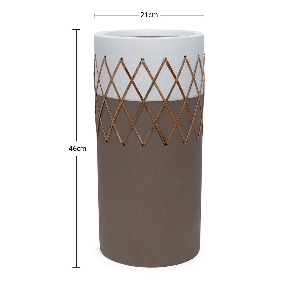 Elevate the charm of your indoor spaces by incorporating this ceramic vase into your decor. The glazed vase is dual-toned with white and rough taupe hues, along with a rustic rattan skin weave that make a skilful addition to the appearance like none other.