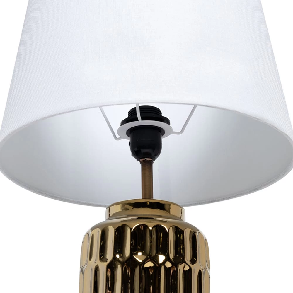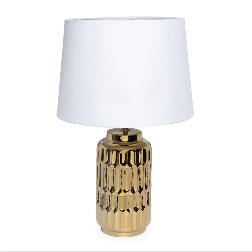 Bring a touch of glamorous style to your bedroom or living room with this table lamp. The shining ceramic body has a trendy design for an artistic flair and a fabric shade completes its look. A bed switch is included.