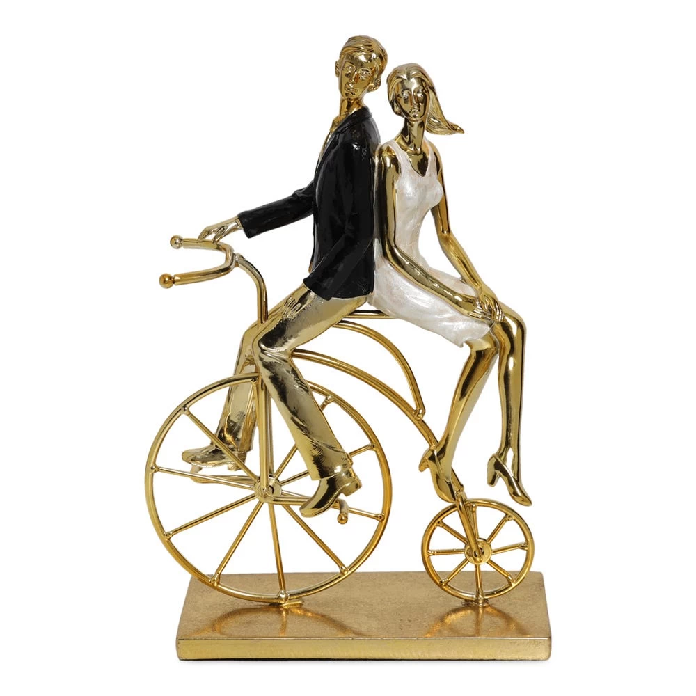 A charming and understated celebration of love and companionship, this sculpture of a couple on cycle adds a touch of effortless whimsy to any decor. The rich gold plating on the resin offers a sparkling luster.