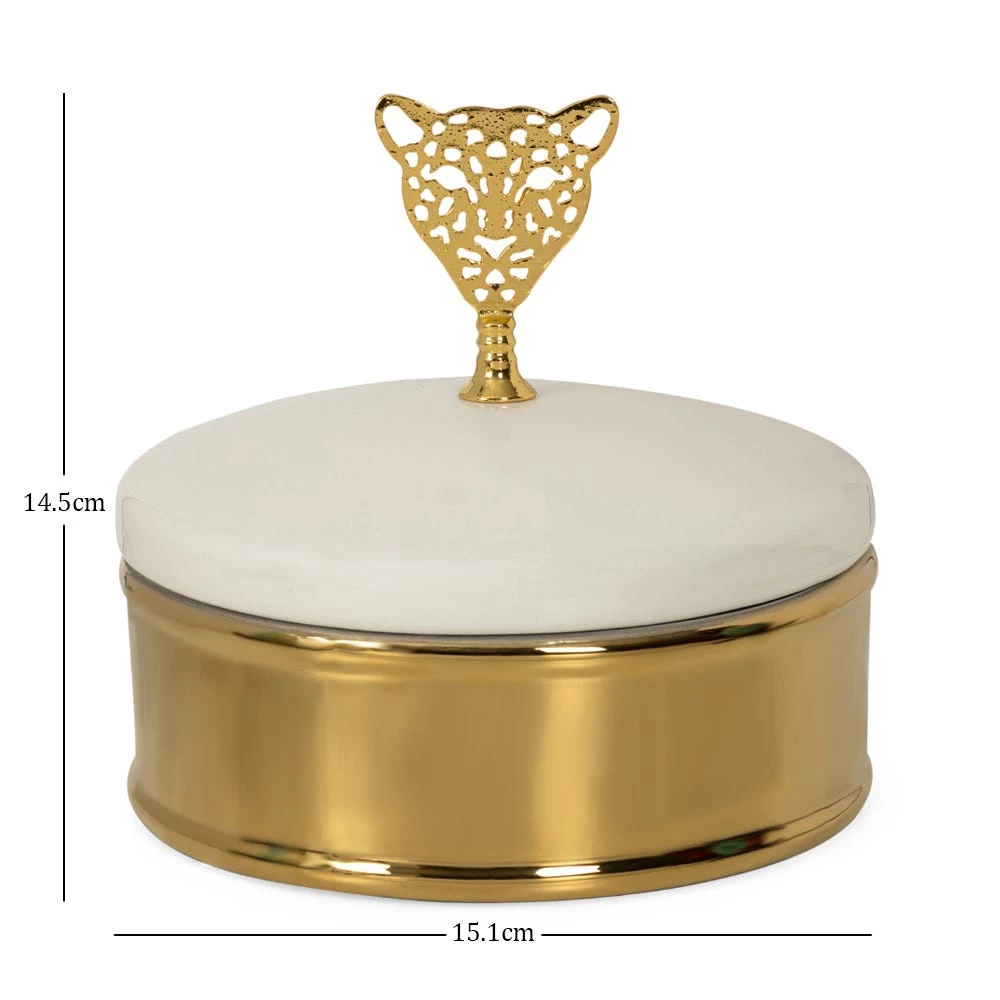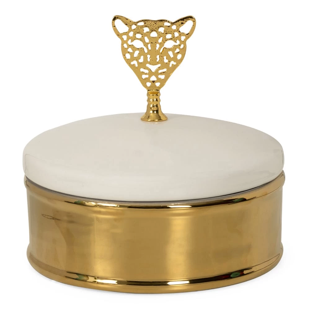 Unleash your inner connoisseur with this exquisite ceramic box and add a touch of sophistication to your home space. Crafted from 100% ceramic ware, this pristine white and gold box is perfect for storing your most treasured possessions or displaying them as a standalone piece. Place this box on a mirrored tray with some scented candles and a vase of fresh flowers for a sophisticated touch to your vanity.