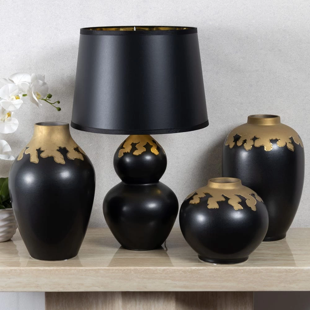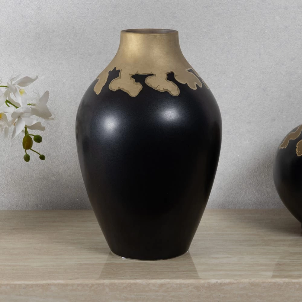 Bold and sculptural, our Della porcelain accessory collection adds a touch of luxury to any space. The accented brushed brass design on the top edge leaves a dramatic impact on the black porcelain body, making the vase an eye-catching piece. This vase looks great when standing alone or in a pair.