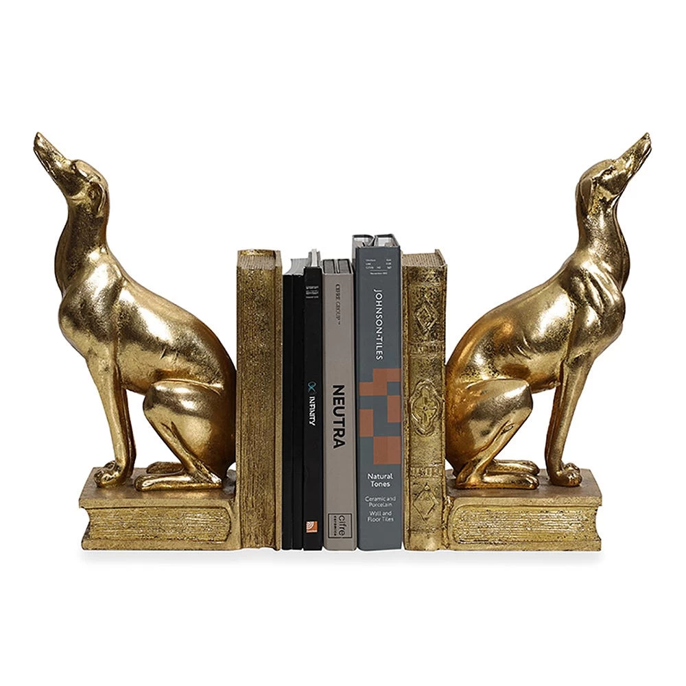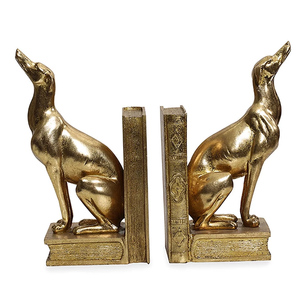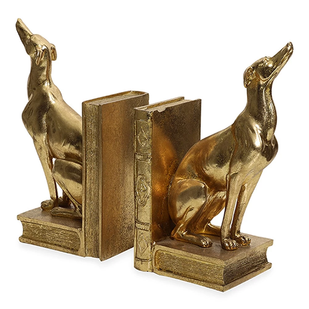Handcrafted primarily from resin, this bookend depicts a pair of playful howling dogs sitting on books. This elegant bookend set catches the eye of onlookers with its golden appearance and antique finish.