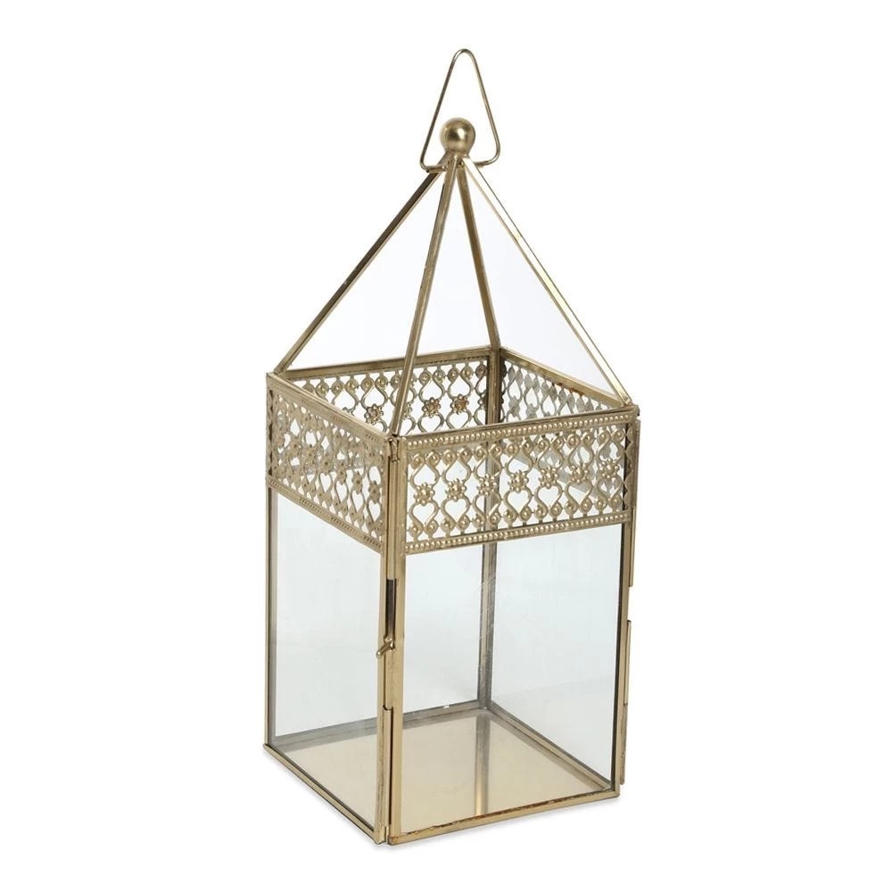 Conical from the top and rectangular beneath, this tealight candle lantern is unique and beautiful. Handcrafted with a combination of glass and metal, this tealight lantern is intricately designed and dons an elegant gold hue.