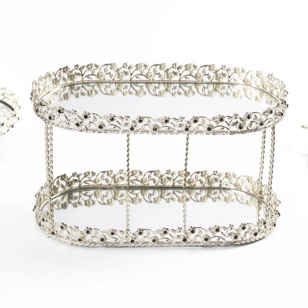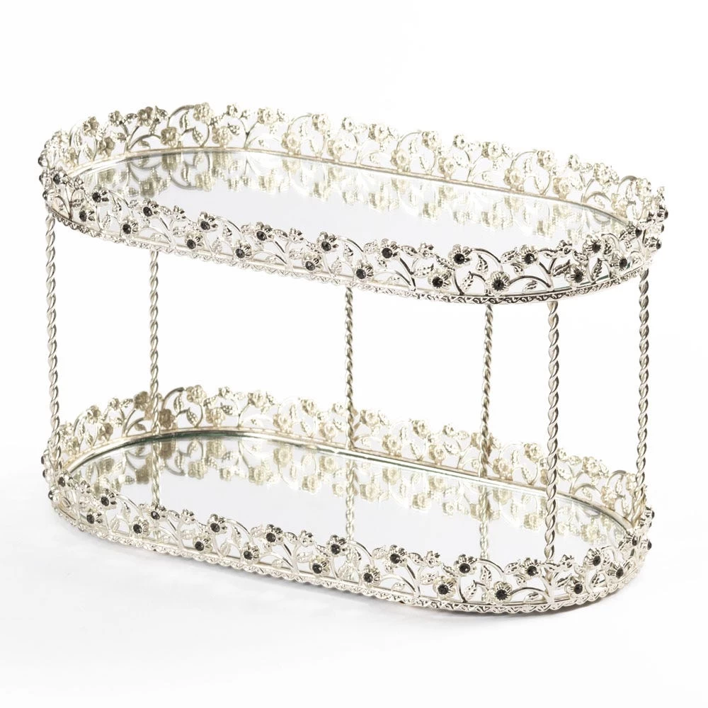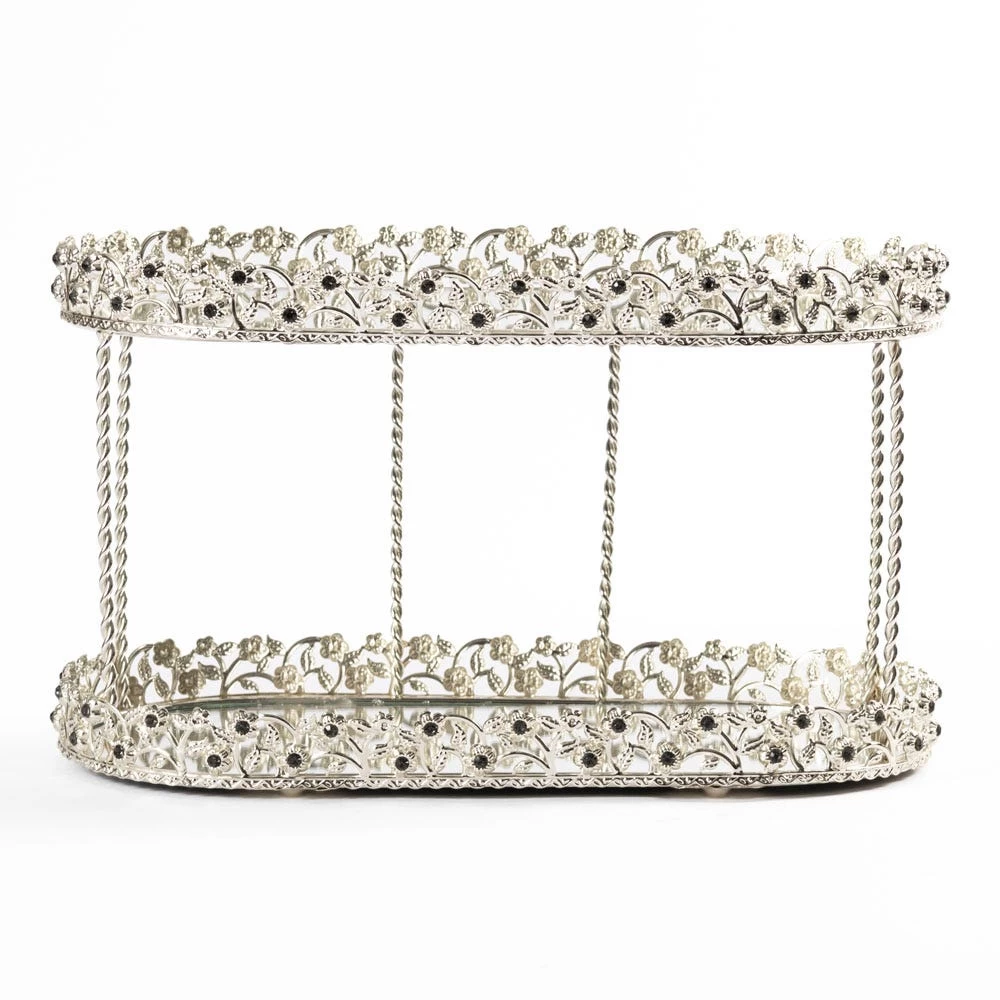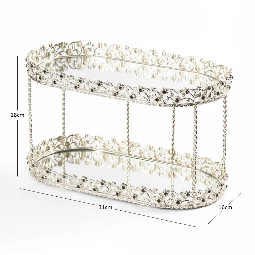 Experience the beauty of fine craftsmanship in your abode with this must-have two-tier perfume rack. Featuring two tiers, this piece is perfect for safely storing, organising, and displaying your priced collection of fragrances. It is fashioned using metal and mirror or glass, and flaunts an intricate floral and leaf design and a shiny finish, lending a touch of elegance to your vanity.