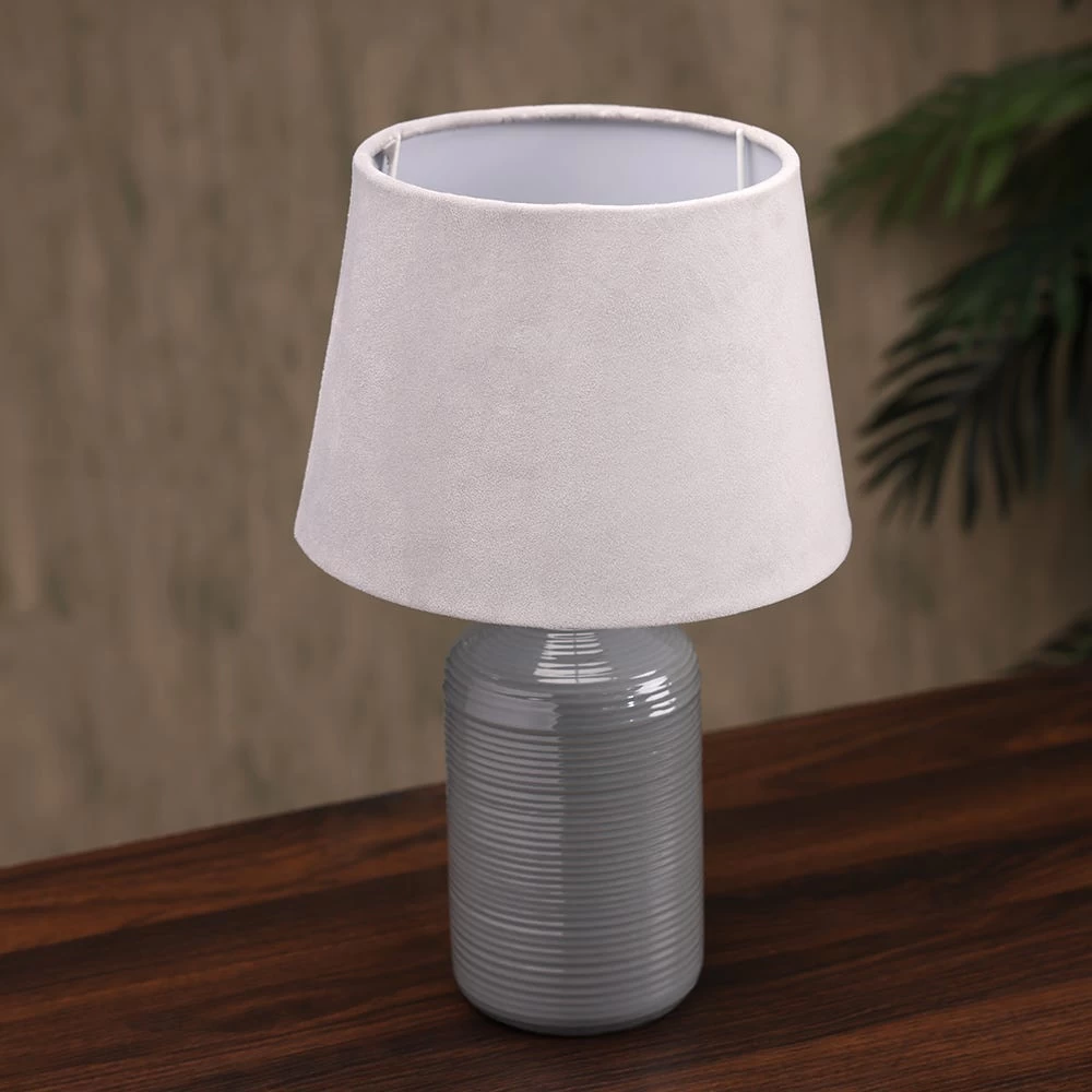 Featuring a seamless striped pattern on the exterior, this ceramic table lamp in grey is sure to accentuate your home décor. The glossy finish of the ceramic body and the textured fabric lampshade in white elegantly illuminate any home décor setting. It needs an E14 bulb of 40W to light up your surroundings and is available in other colour options as well.