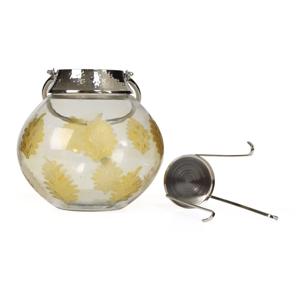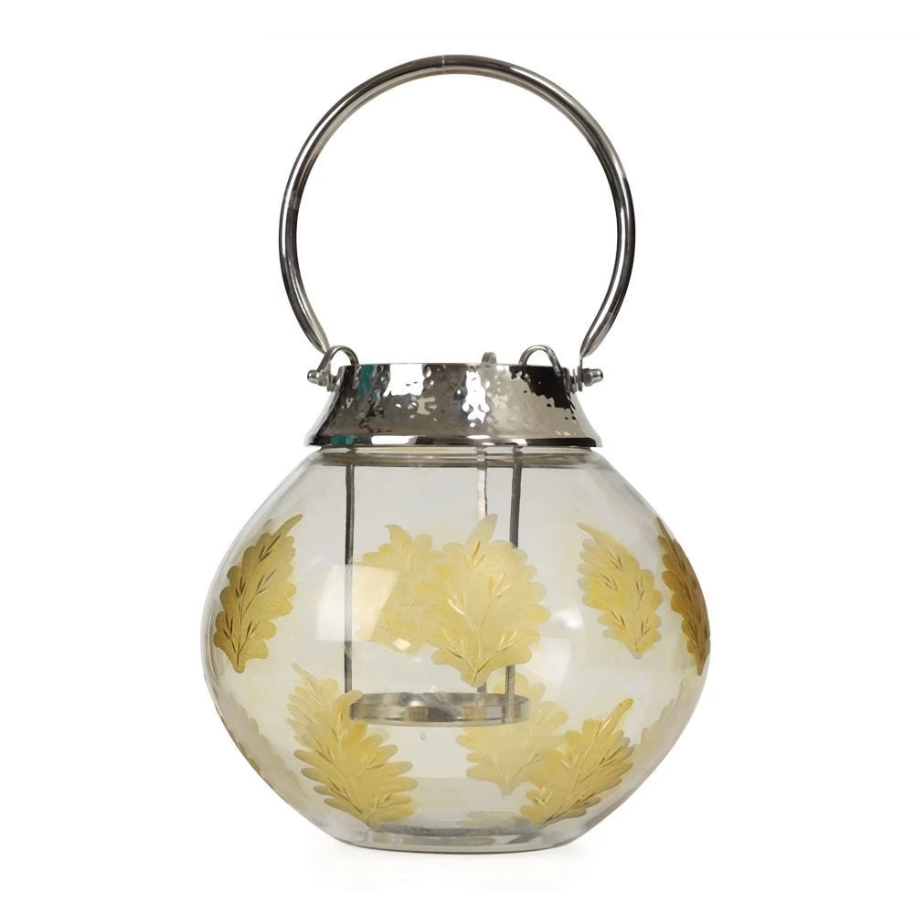 Add some sparkle to your festive or special occasions with this stunning round glass candle lantern. Sporting hand-painted details in gold over its etched leaf designs, this clear, handcrafted lantern features a thick glass frame and a hanging loop.
