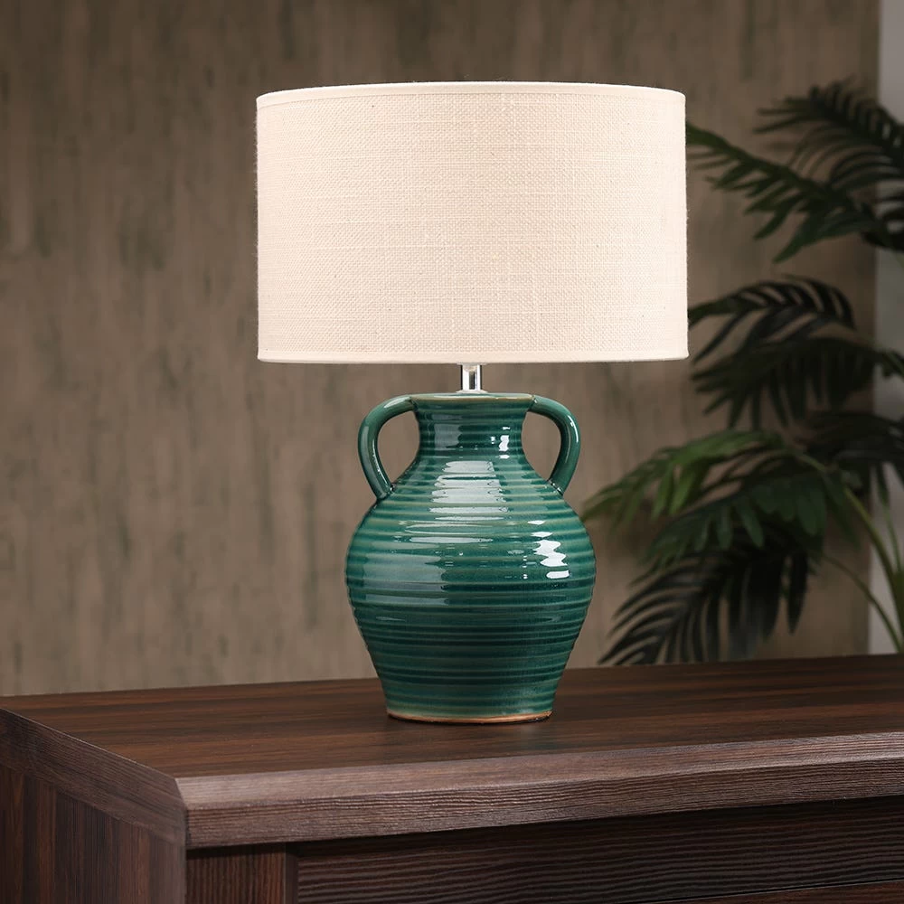Bring a modern sensibility to any space with this striking ceramic table lamp. Sporting a vase-like layout in green with a glazed finish and smooth striped details, the accent table lamp is completed with a linen lampshade that emits light with the addition of an E27 bulb of 60W.