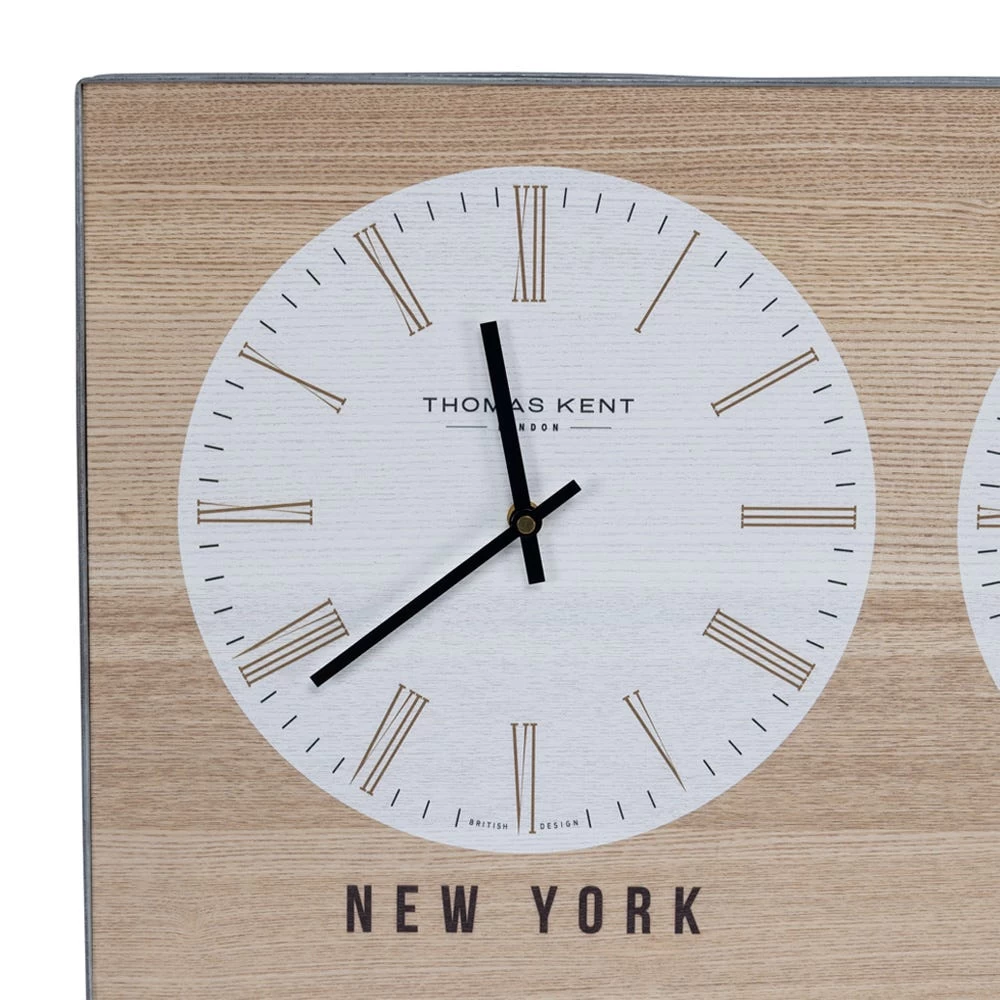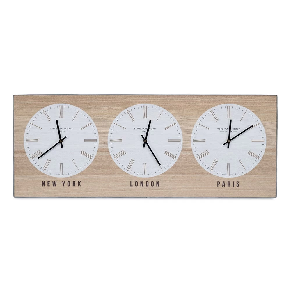 Make a striking addition to your home with this three-time zone wall clock. Sporting a wooden appeal, this wall clock shows you the time zones of New York, London, and Paris with three different clocks flaunting roman numerals and stylish black hands. It requires three numbers of 1.5 AA batteries to function.