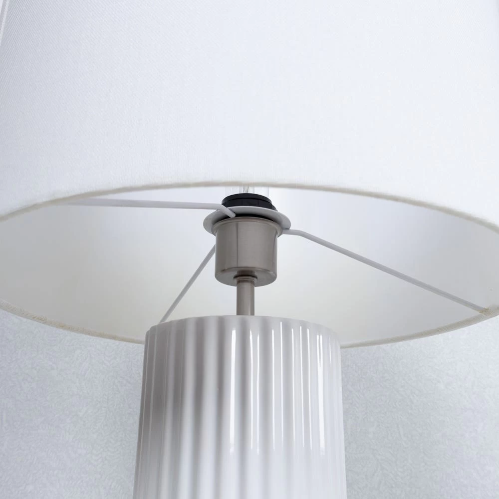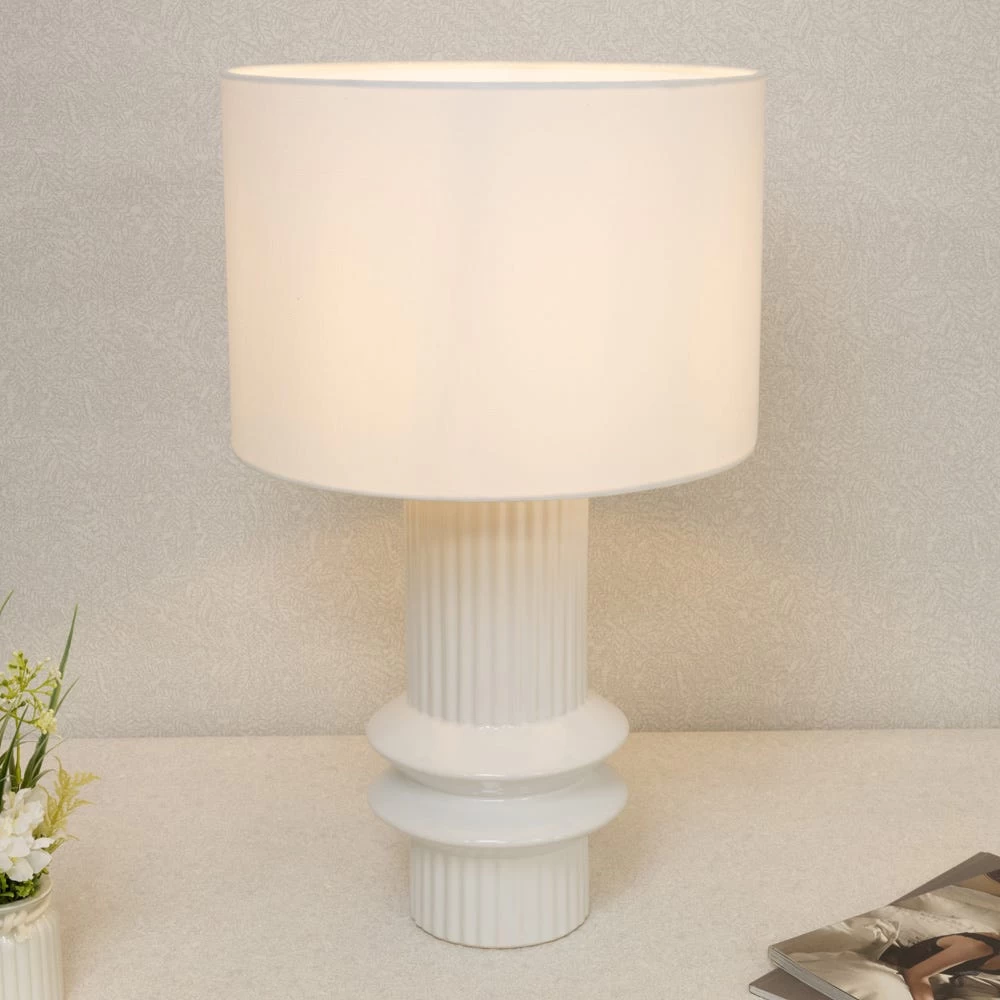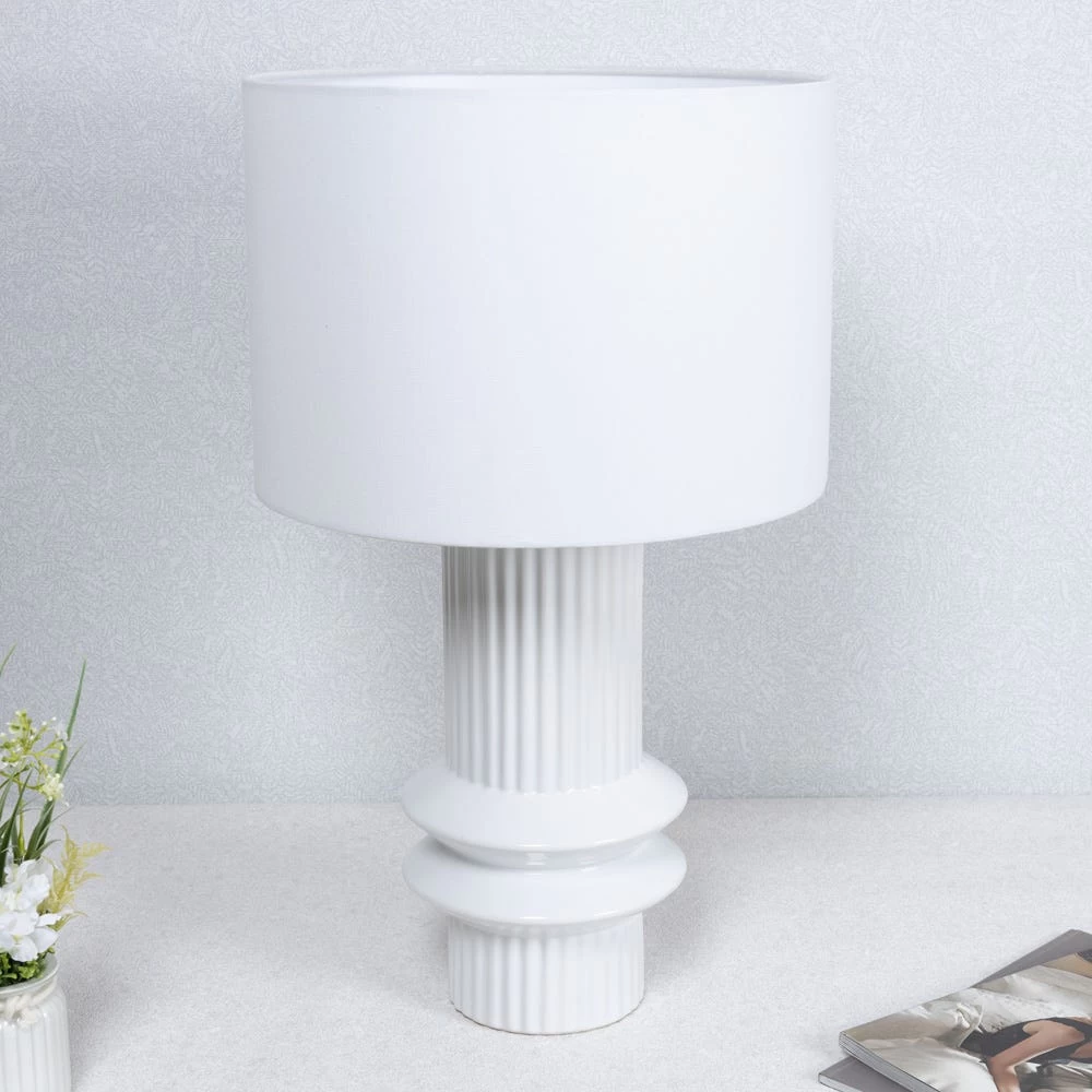 A sophisticated ceramic lamp that illuminates your living space with an aesthetically soothing glow, this lamp adds a pleasing decorative touch. The classic neutral silhouette of the lampshade is embellished with a sturdy ceramic white stand, making it a perfect home decor accent for your living room, bedroom, or hallways.