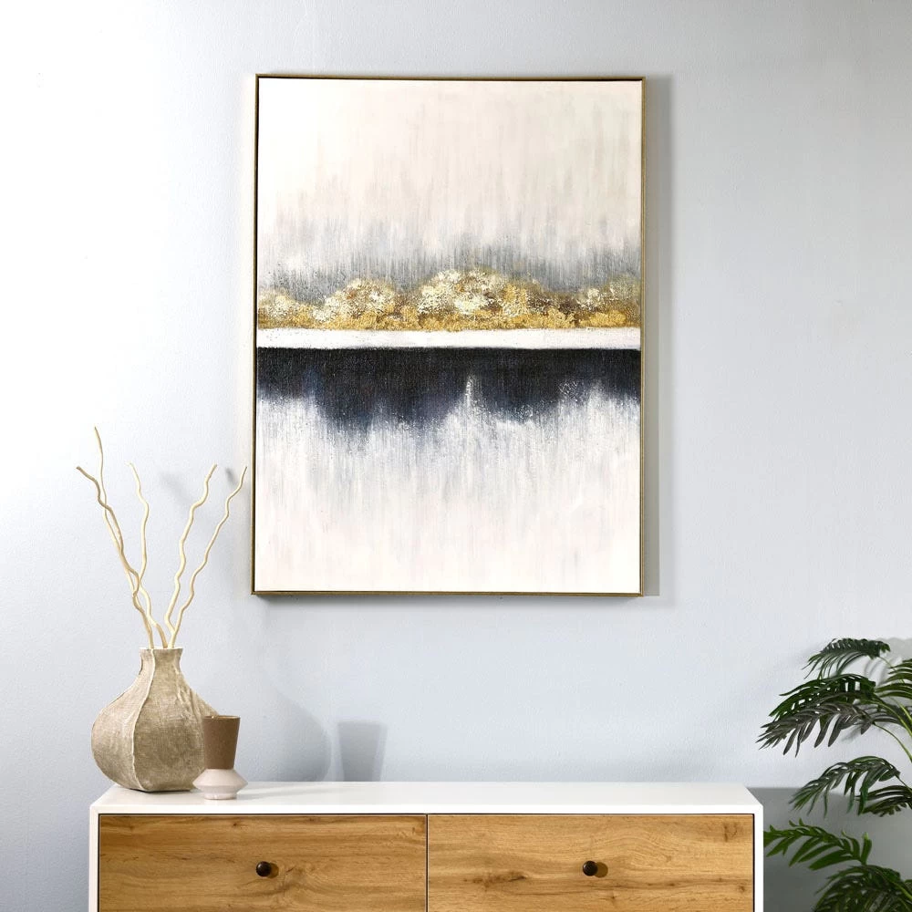 A breathtaking statement piece for your luxurious lifestyle in a stunning combination of gold, white, and blue, demanding attention and admiration. This stunning piece features a 100% handpainted design with accents of gleaming gold foil for a truly sophisticated finish. Place it in a statement hallway or on a feature wall in your bedroom for a touch of glamour.
