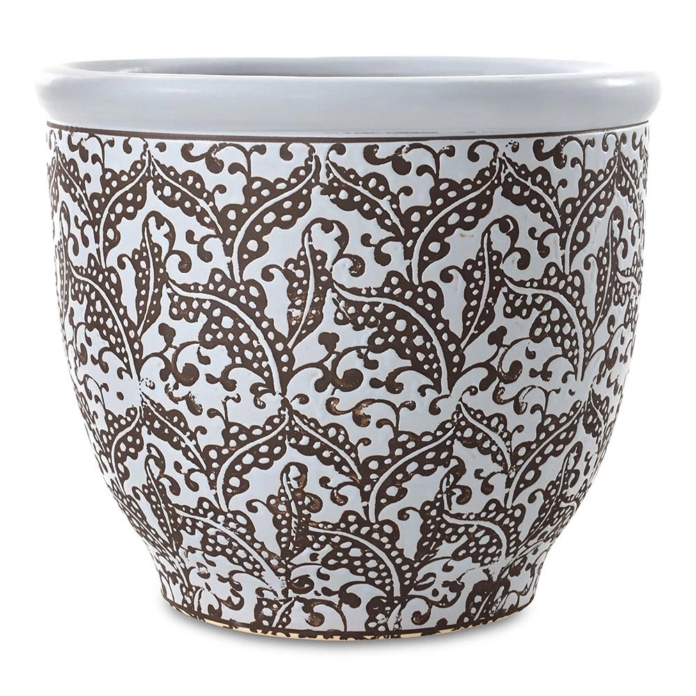 Add a traditional touch to the green space of your home or garden with this eye-catching planter. Made of ceramic with a glaze finish, this pastel blue planter showcases stunning motifs in a contrasting hue with a vintage appearance. Find this ceramic planter in three different sizes.