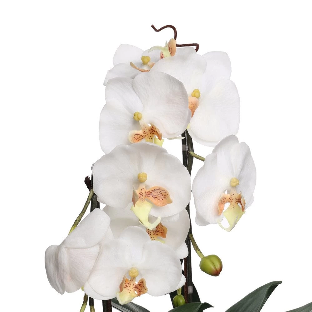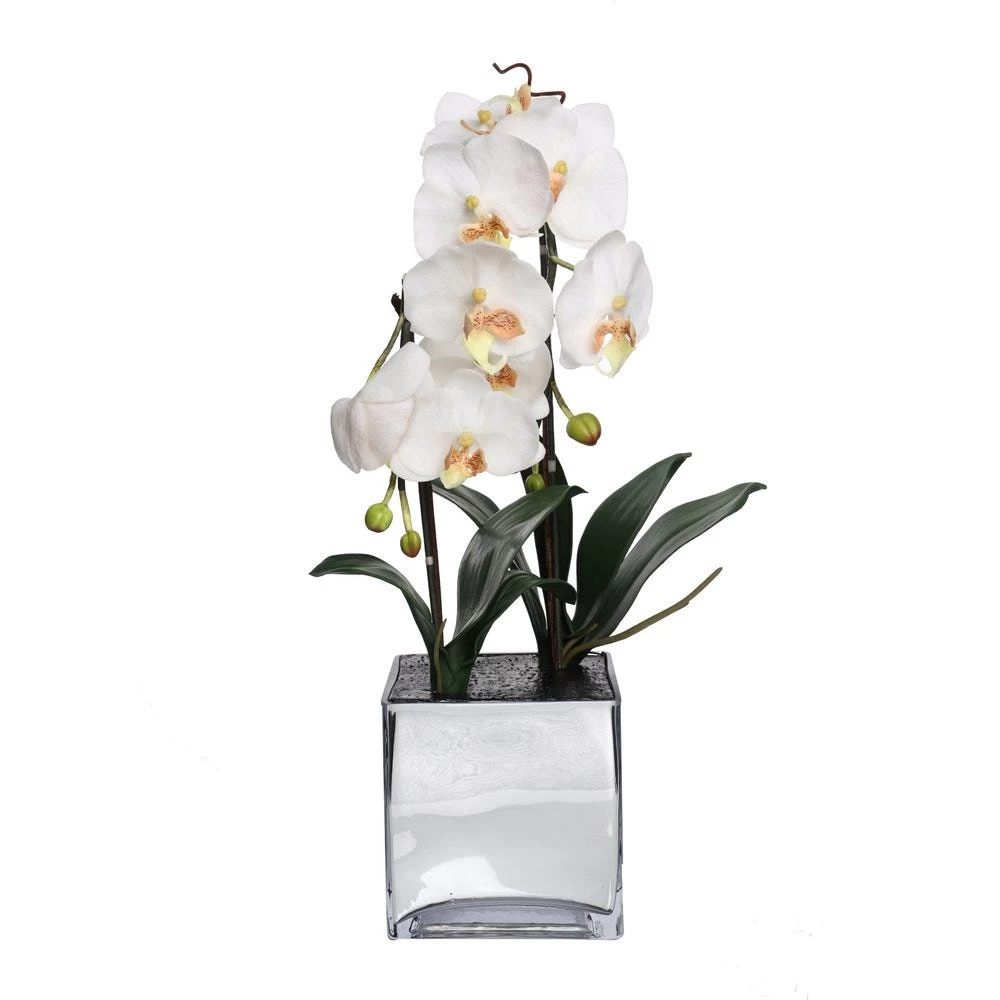 Bring in the captivating glow of the Phalaenopsis orchids that will make your home look more vibrant. A perfect tabletop accessory, this tiny arrangement of white artificial flowers with radiant yellow accents placed in a square-shaped glass pot will bring life to any living space.