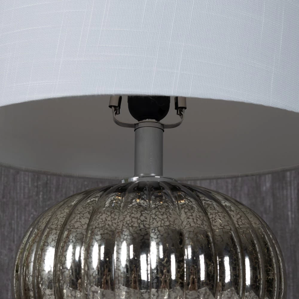 Set the perfect ambiance in any room with the addition of this charming table lamp. An orb-shaped base in ribbed glass shines with a silver leaf interior, while the white fabric lampshade casts the ideal warm light when combined with a 60W E27 bulb.