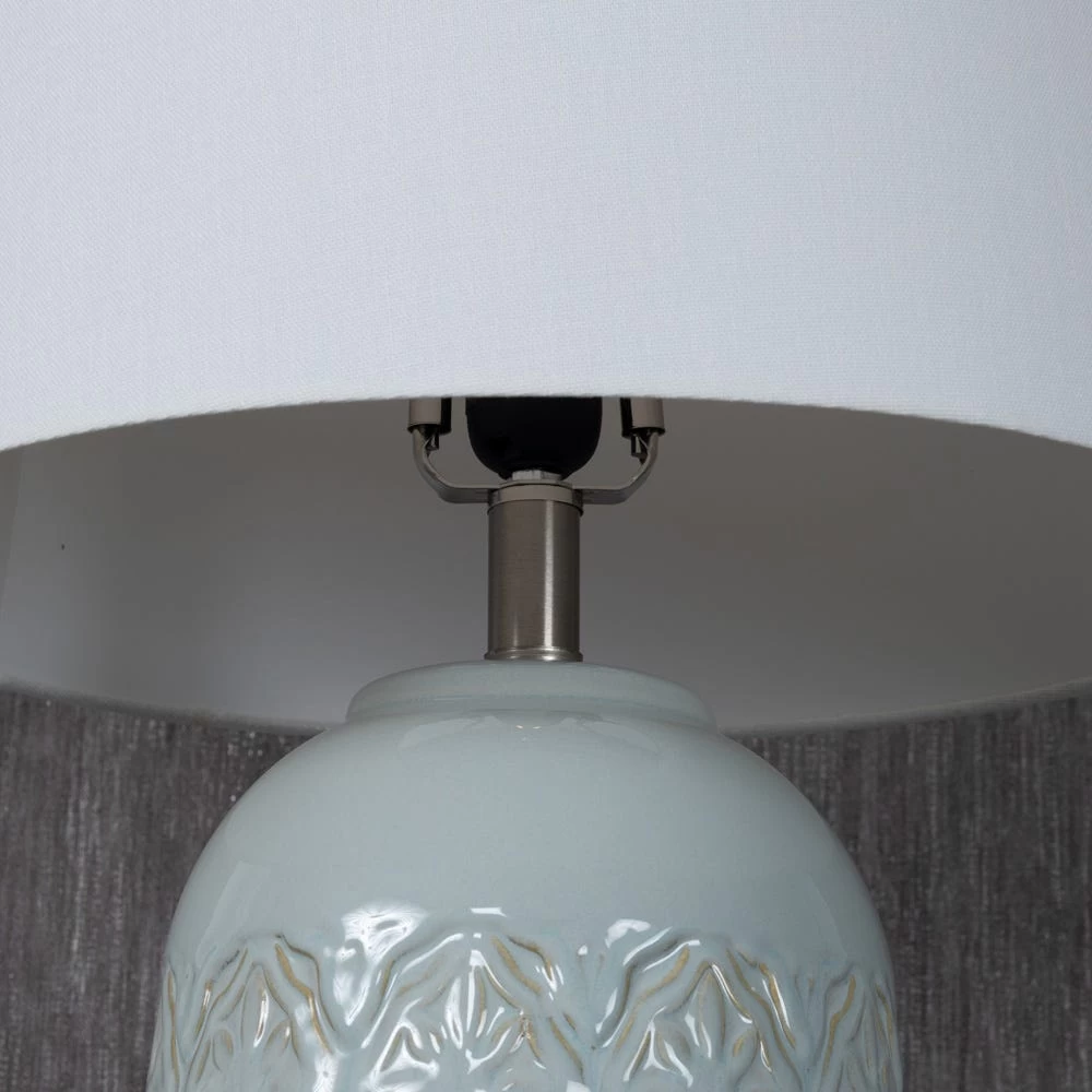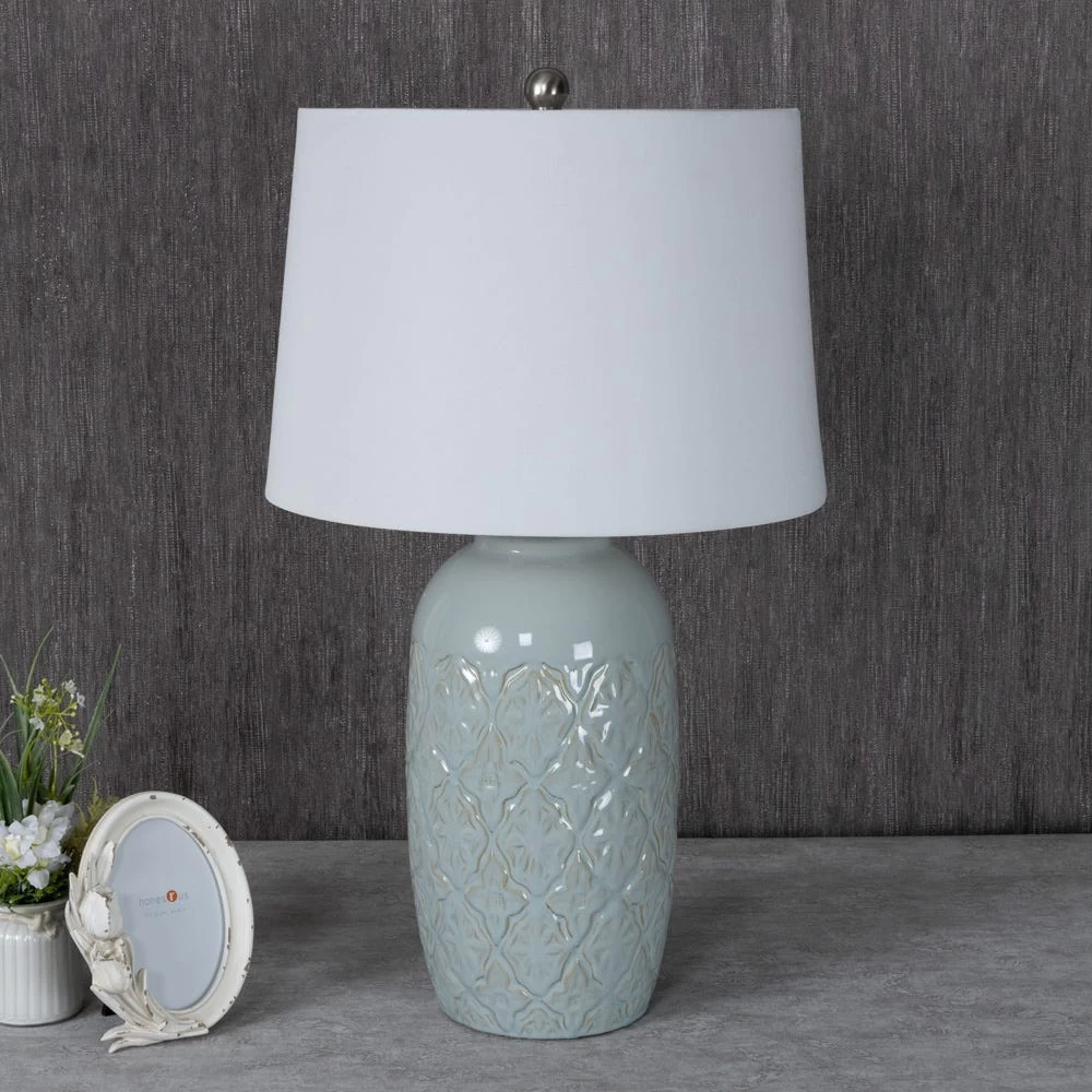 Bring together texture and eye-soothing colour to your tablescape with this attention-grabbing table lamp. This table lamp is designed with a ceramic base having a floral textured pattern and is completed with a classic-styled fabric lampshade. Add an E27 bulb of 60W for this lamp to function.