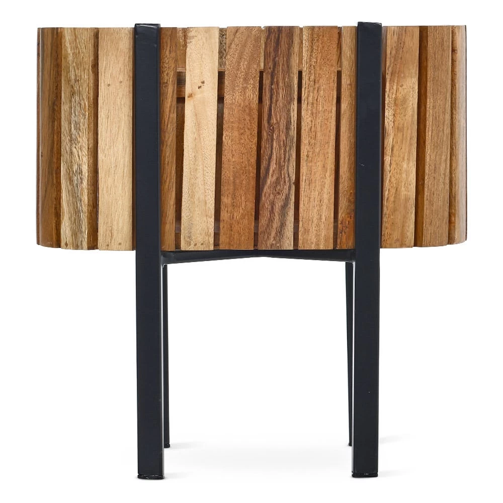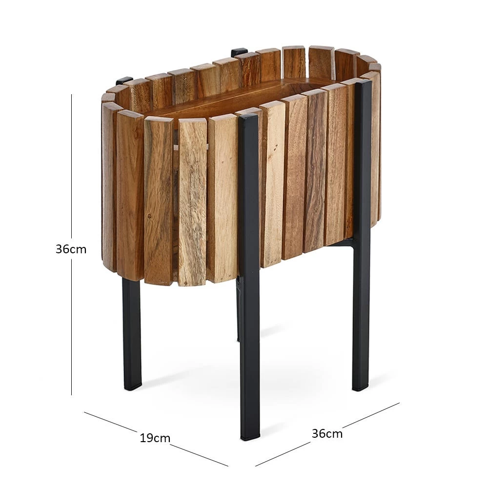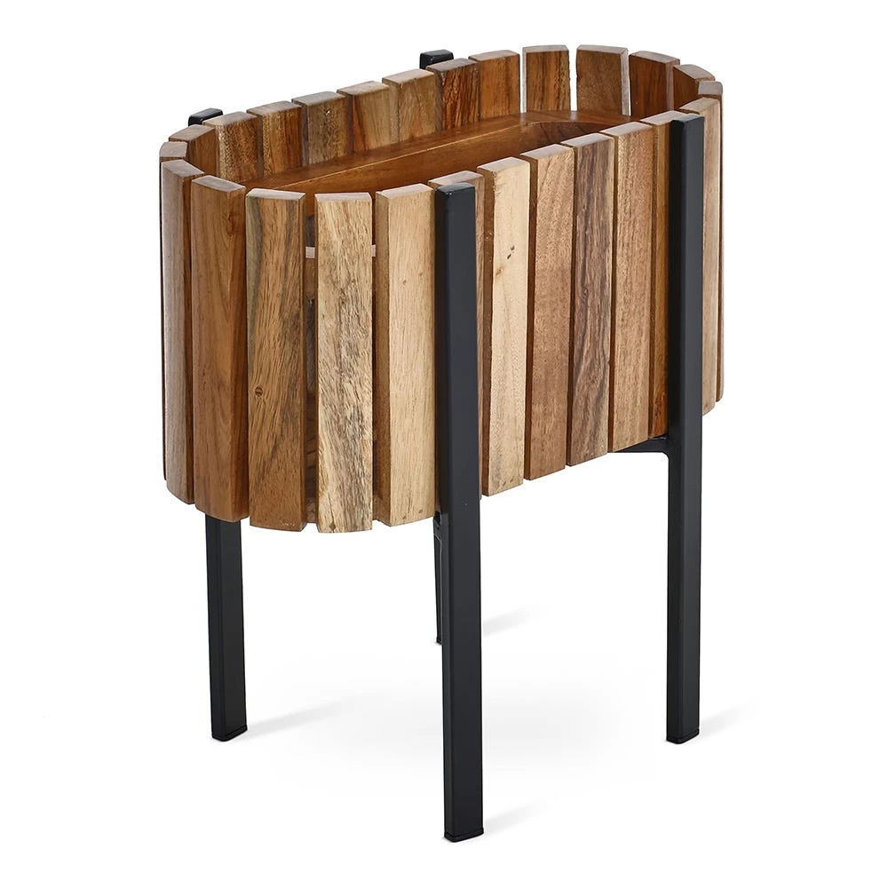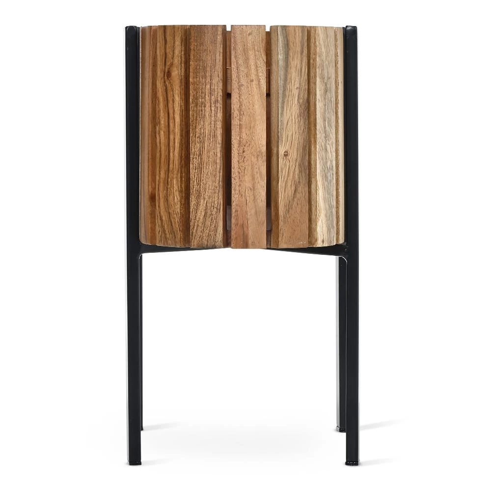 Create a stunning display of greenery with this stylish planter stand and bring some opulence to your indoor garden. Crafted with wooden stripes, this planter stand boasts a unique design paired with sleek iron metal, creating a perfect finish combo to elevate any space. Pair this decorative planter stand with lush green foliage and colourful flowers to create a stunning indoor garden oasis.