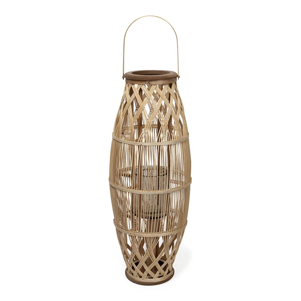 Exude sophistication and grace with this astonishing tall bamboo lantern. This intricate masterpiece makes a perfect centrepiece for adding tranquillity to any space where it stands. With a case inside holding pillar candles for a warm glow, this art piece is ideal for creating an elegant ambience.