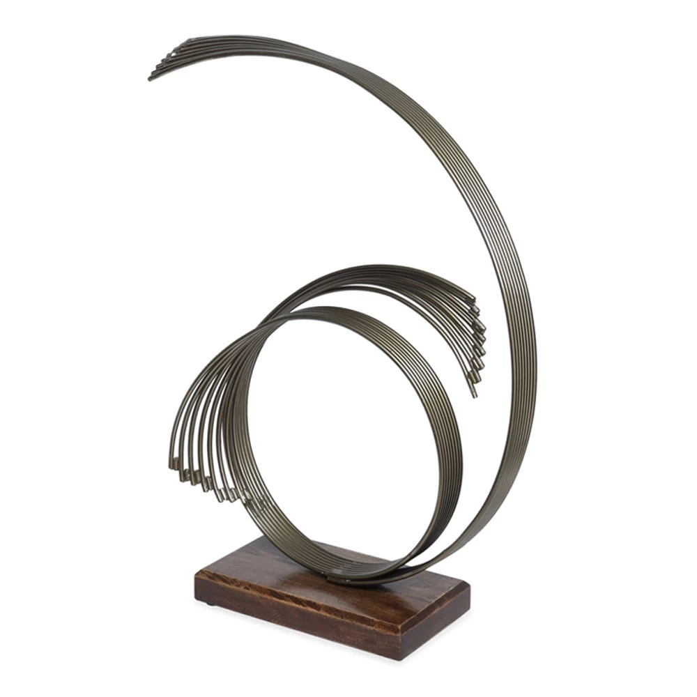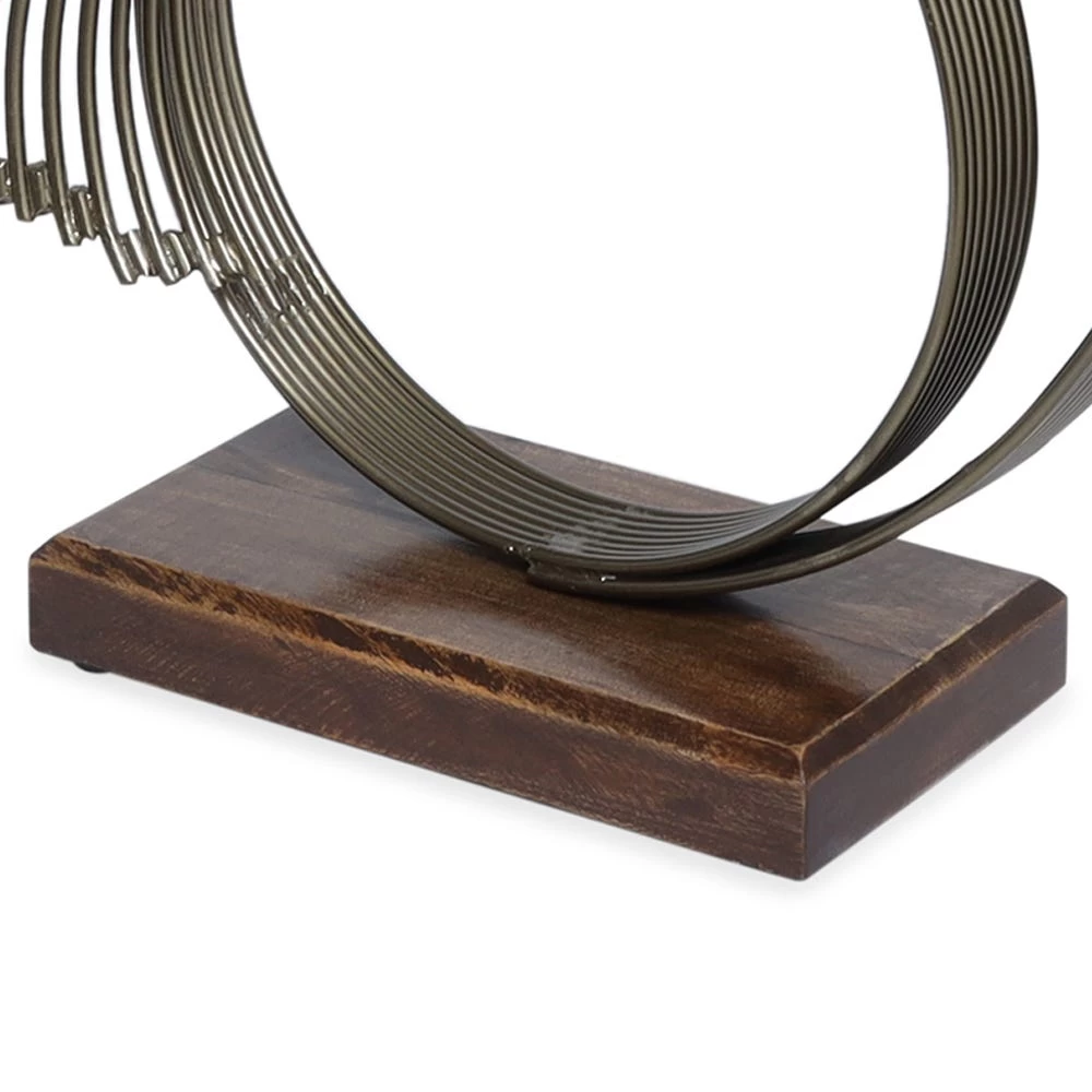 Set on a wooden base, this artful sculpture has an abstract, infinite design to flaunt. Decked up with a warm antique brass finish that livens up the look, this sculpture is an exemplary example of the craftsmanship of Indian artisans.