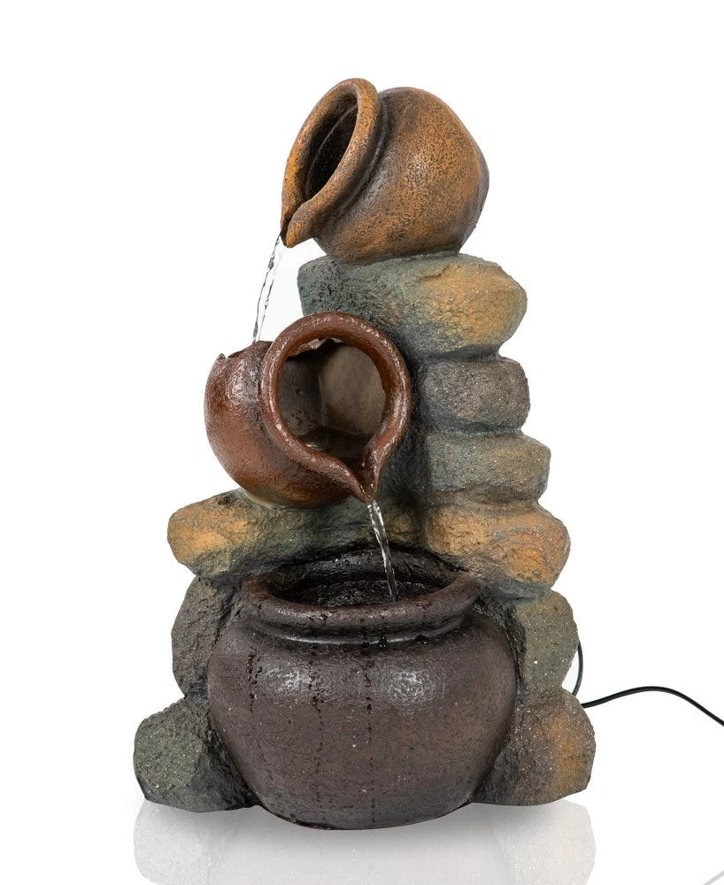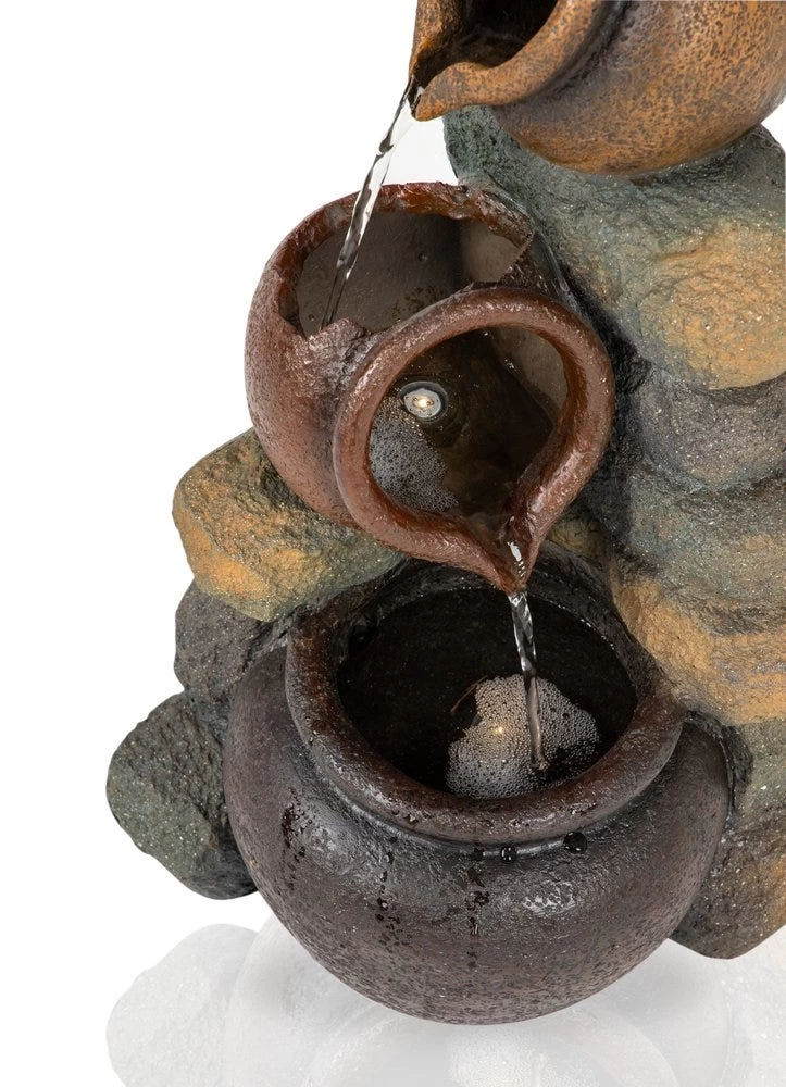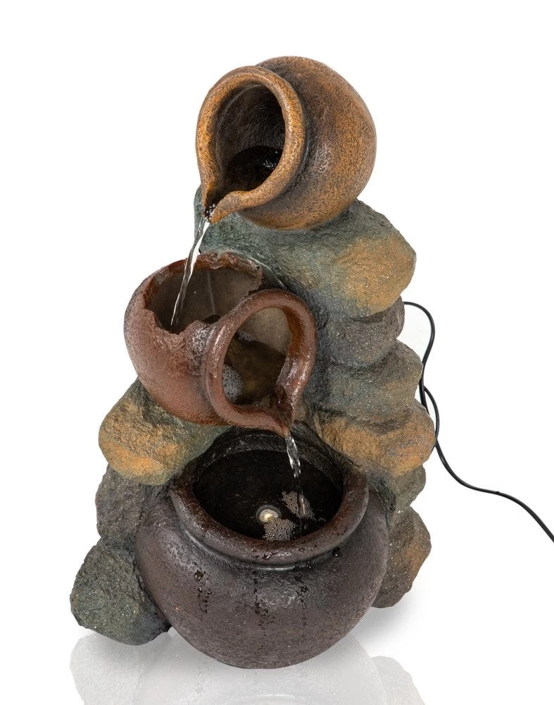 This outdoor water fountain is an artistic beauty to decorate your garden or balcony with. Showcasing an array of exquisite resin pots over a bricked wall, this stunning décor piece is infused with LED lights and is lightweight.