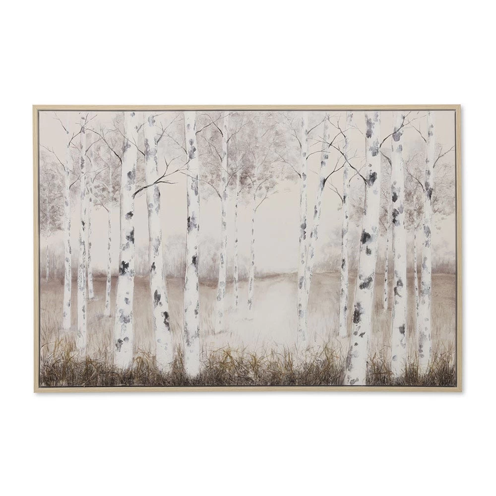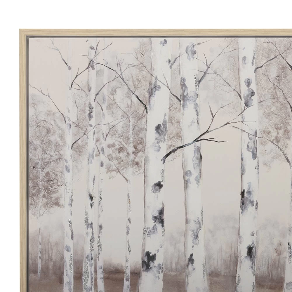Featuring surreal tall trees in a neutral grey palette, the art piece is inspired by nature. Housed in an elegant wooden frame, this canvas artwork captures the essence of the wilderness and carries the shine of silver foil for a textured flair.