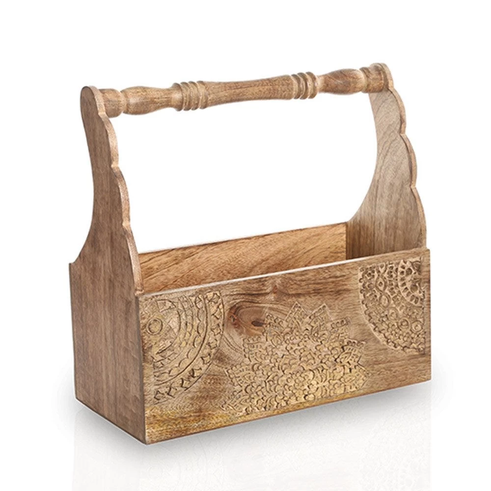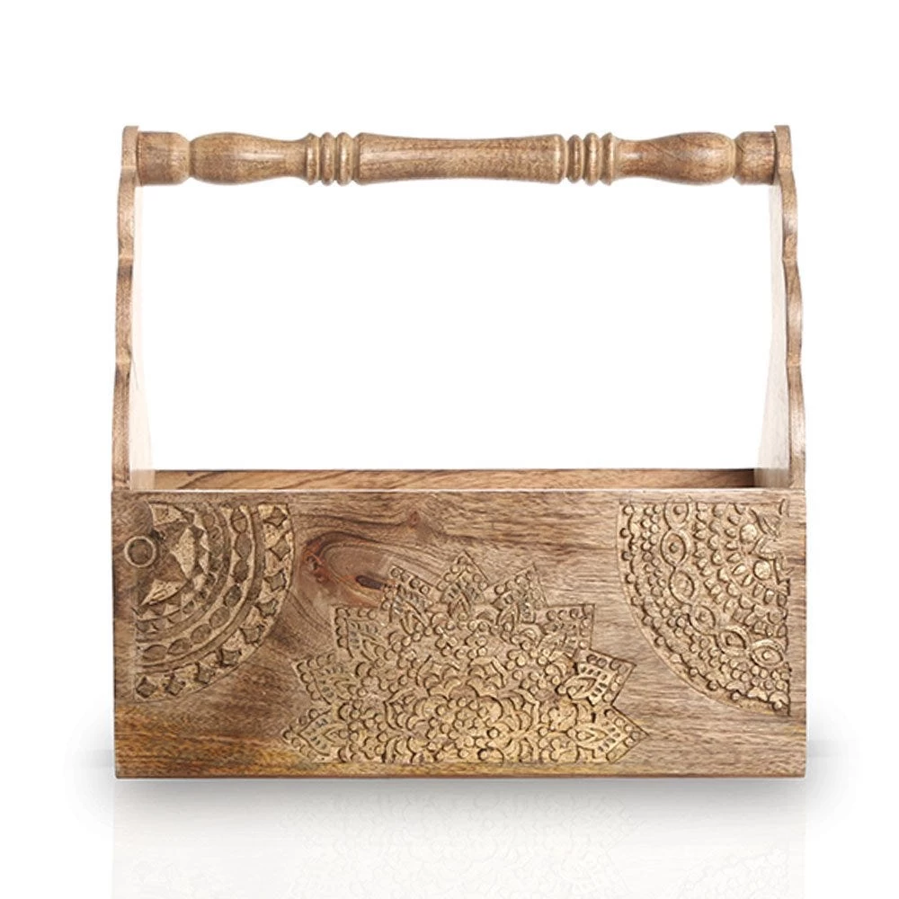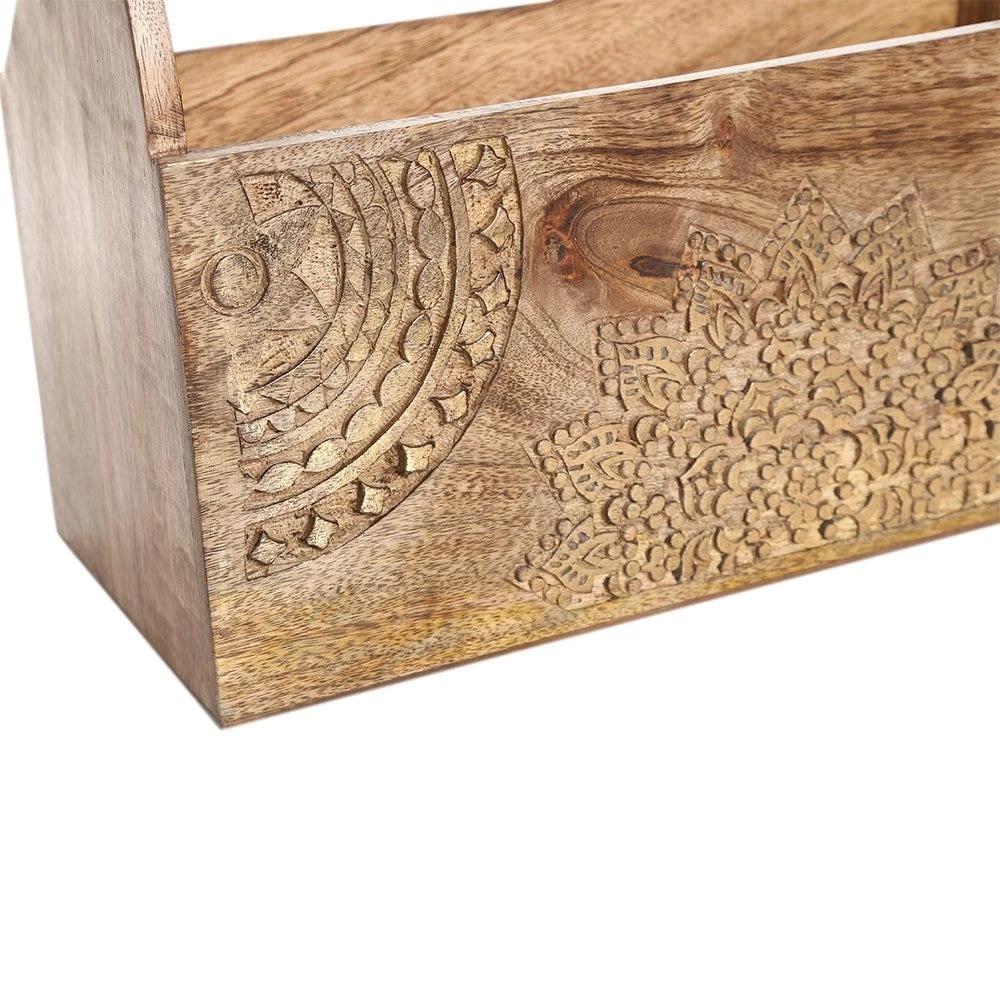 Serving the purpose of holding magazines and newspapers with ease, this vintage-styled wooden piece is both a utilitarian and décor piece. Hand-carved with attractive mandala art designs, this magazine holder is easy to carry and can be placed in any desirable place.