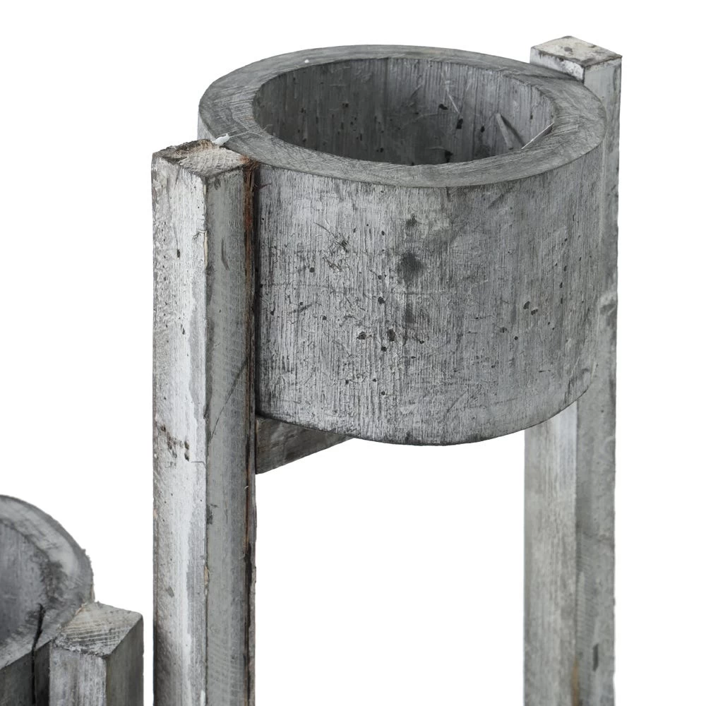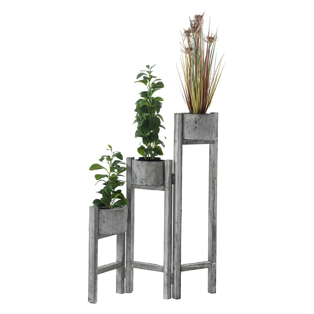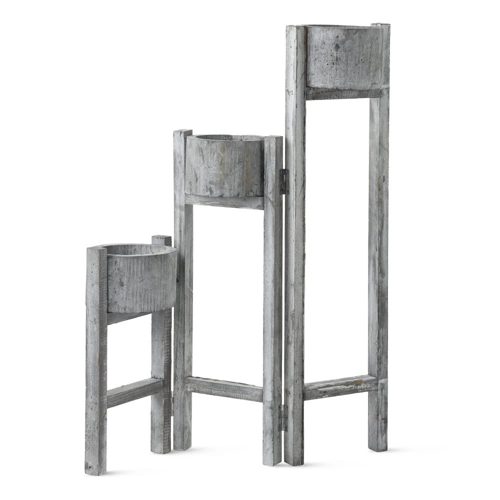 The grey whitewashed wooden stand is great for any vintage, farm-inspired, or country-themed decor style. Furnished with three pots, this space-saving handcrafted wooden piece with a distressed weathered finish looks perfect indoors or out.